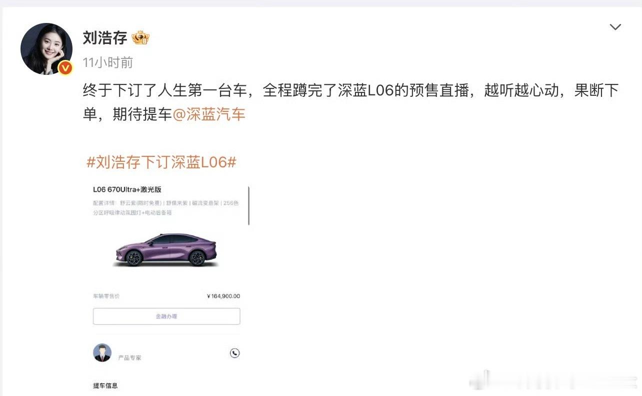 刘浩存晒新车订单浩存很美深蓝L06也很帅所以美女配靓车大家认同不[doge]