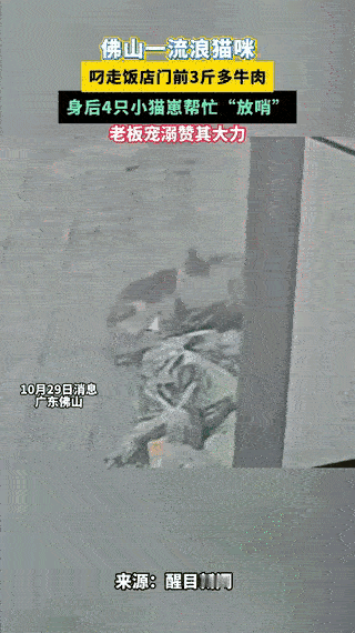 广东佛山一饭店早上六点多,老板把三斤多牛肉放在门口。一只瘸腿猫叼起牛肉就跑,后面跟着四只小猫。猫妈妈一扭一扭往暗处拖,小猫还帮着望风。 老板看监控笑了,说这是常来要饭的咪咪,以前总喂它。这次偷肉算了,四只小猫要吃饭呢。网友看了直夸老板心软,说他以后会发财。 流浪猫带着孩子偷东西,老板不但不生气还当没事。有热心人问能不能接济这猫一家,老板说以后继续给口饭吃。这事就这么过去了。