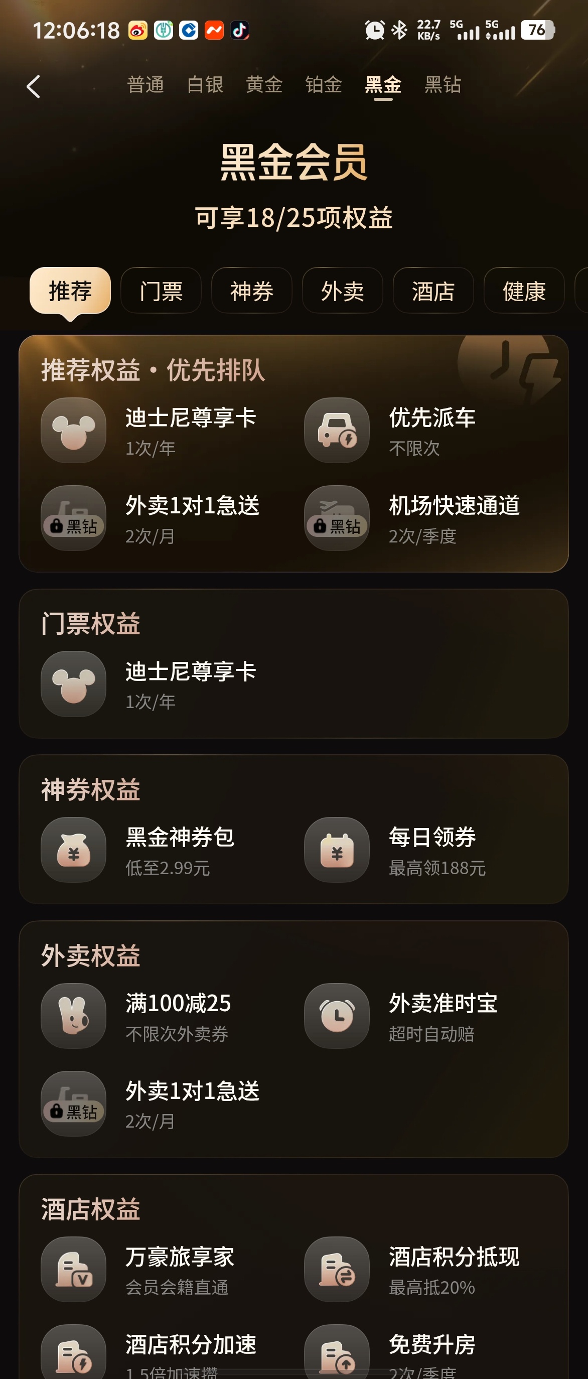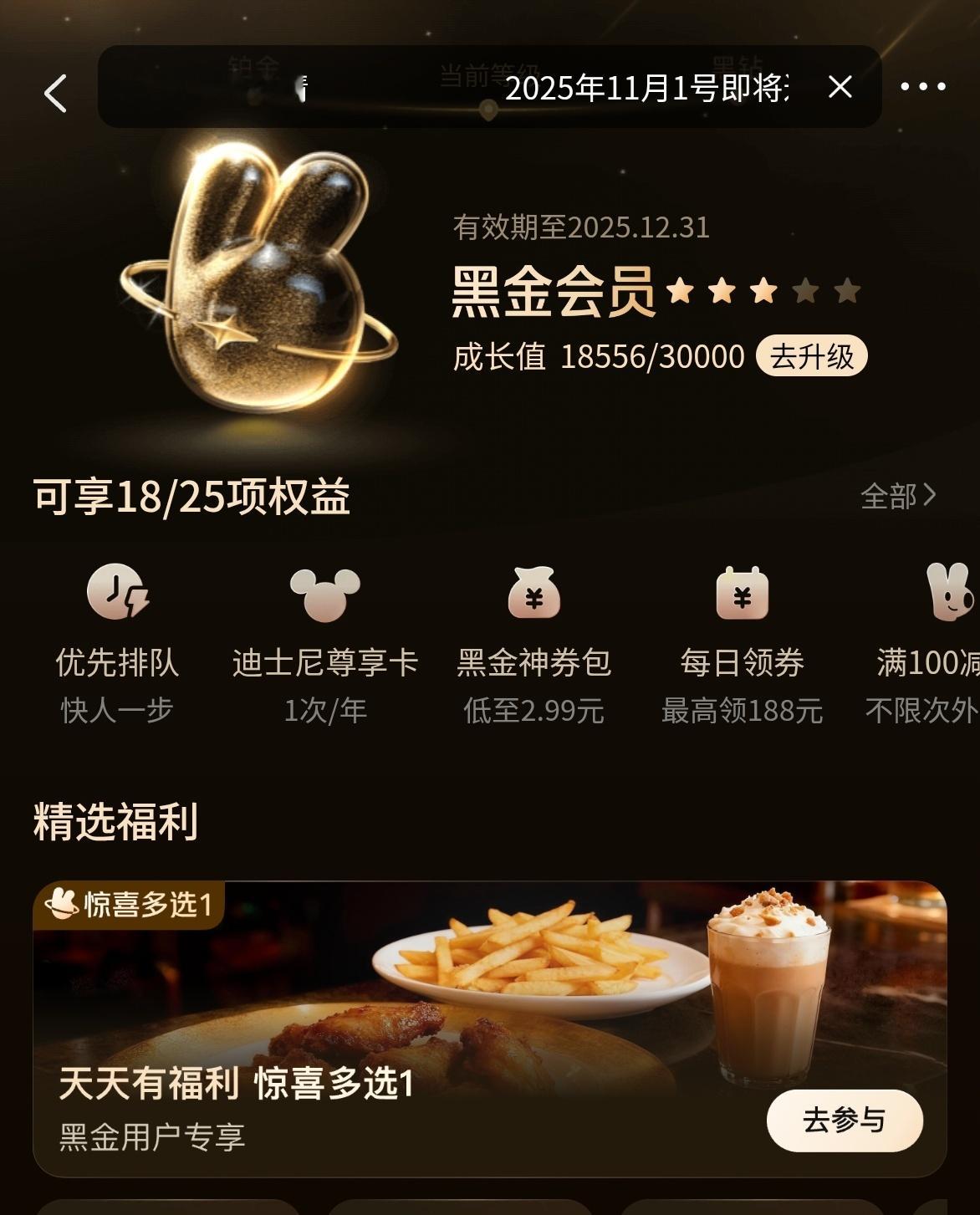 美团会员免单惊喜多选一该说不说,美团这个黑金以上权益确实爽,尤其是一对一专送,迪士尼买票送两个优速通,还有那个黑钻神卷包(比单买的卷便宜好多)