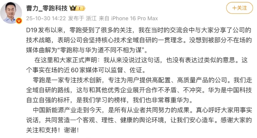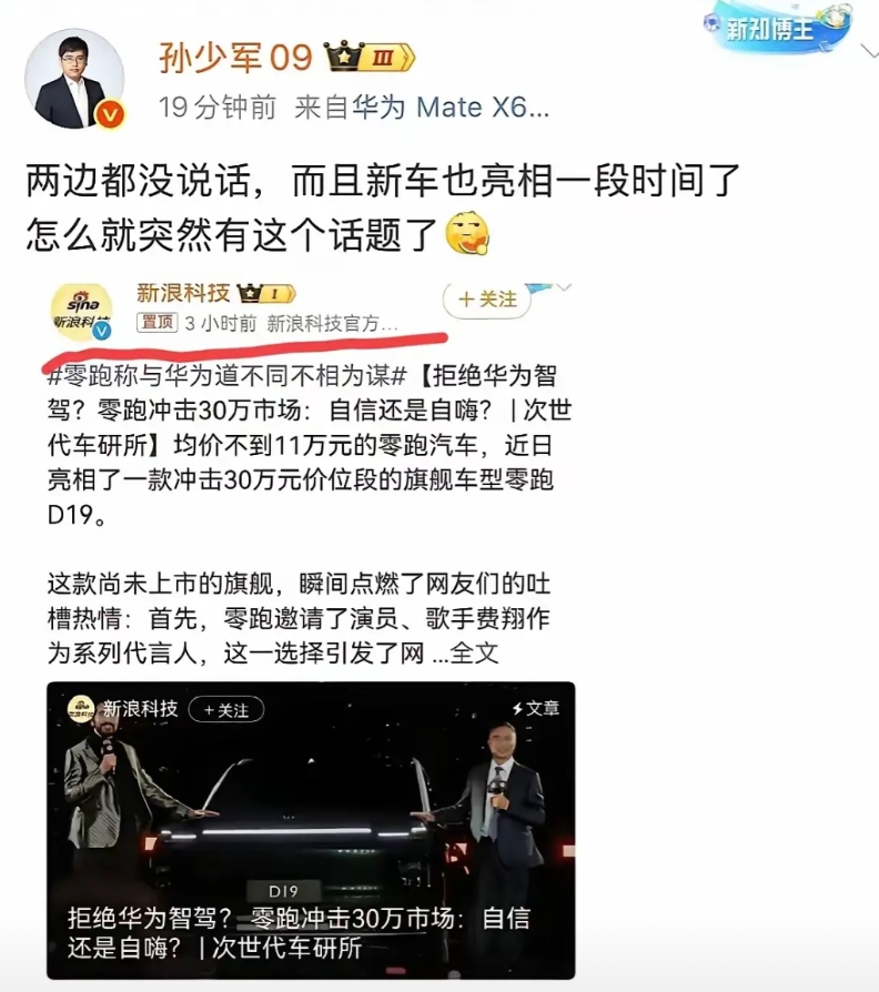 新浪也成不群了? 前几天新浪发了一条新闻说零跑与华为道不同不相为谋,起因是零跑即将发布的旗舰车型D19选择使用自研的辅助驾驶而不是华为智驾。 今天零跑曹总辟谣:零跑没有说与华为道不同不相为谋,也没有表达过类似的意思,相反,零跑很尊重华为。 那么问题来了,是新浪要挑拨离间零跑和华为的关系?还是另有幕后黑手?