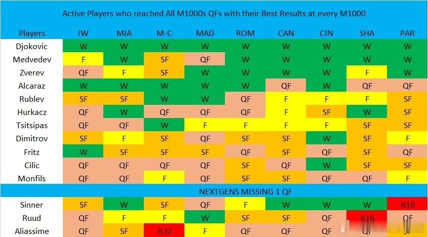 德约科维奇、阿尔卡拉斯、辛纳、兹维列夫、弗里茨、梅德韦杰夫、西西帕斯、卢布列夫、迪米特洛夫、西里奇、孟菲尔斯、胡尔卡奇