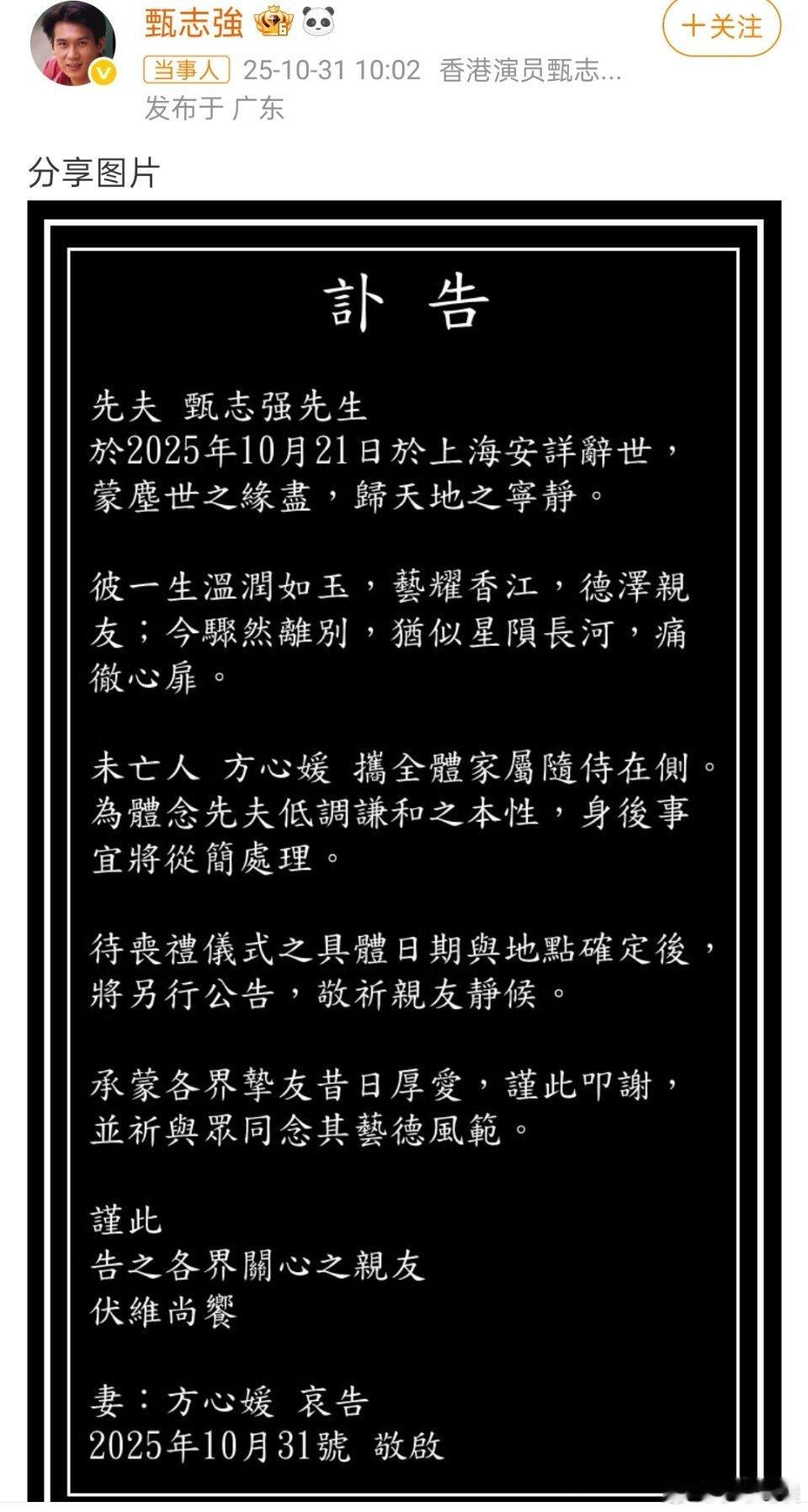 香港老一辈的演员越来越少了,甄志强妻子发讣告宣布丈夫离世,享年59岁[蜡烛]