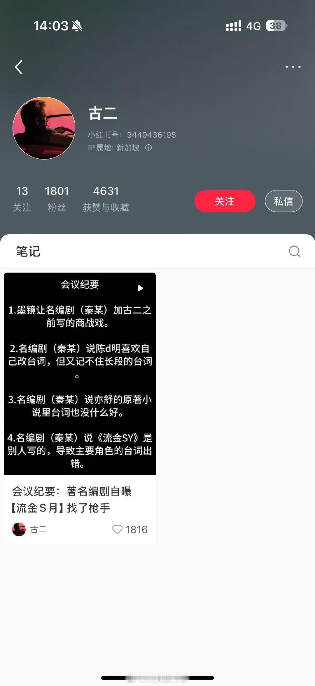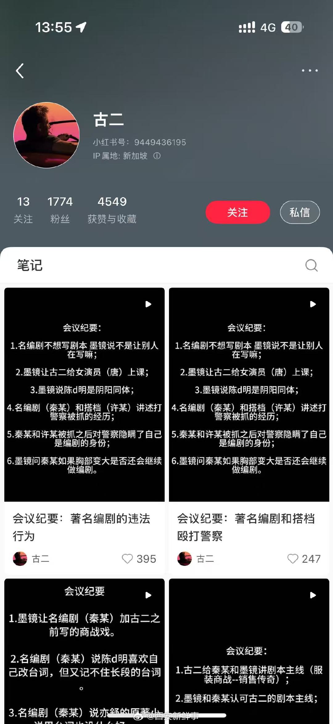 【古二多个爆料内容已不可见】古二公众号已被封禁10月31日上午,青年编剧“古二”在小红书发布多段总时长为一个多小时的对话视频,均以“会议纪要”为标题,其中提到了王家卫说唐嫣很装,截至发稿前去查看多条内容已不可见,仅剩一条。