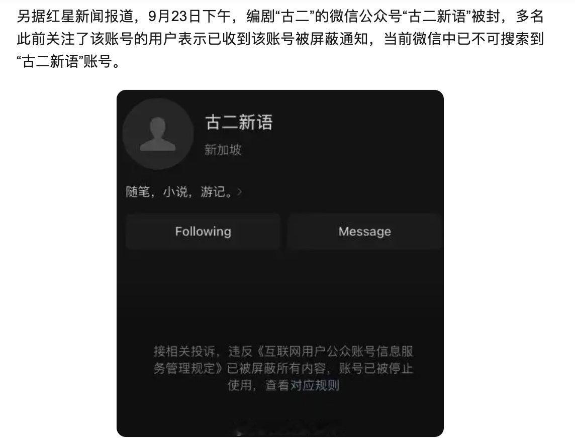 据此前媒体报道,编剧古二的微信公众号被封,多名此前关注了该账号的用户表示已收到该账号被屏蔽通知,当前微信中已不可搜索到该账号。此外查询企查查信息发现,当前唐嫣两起网络侵权责任纠纷案件将于11月5日在上海市黄浦区人民法院开庭审理。