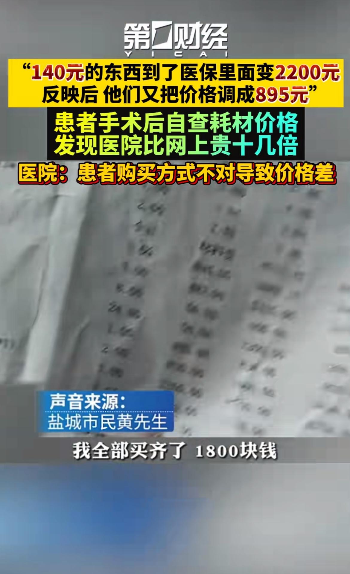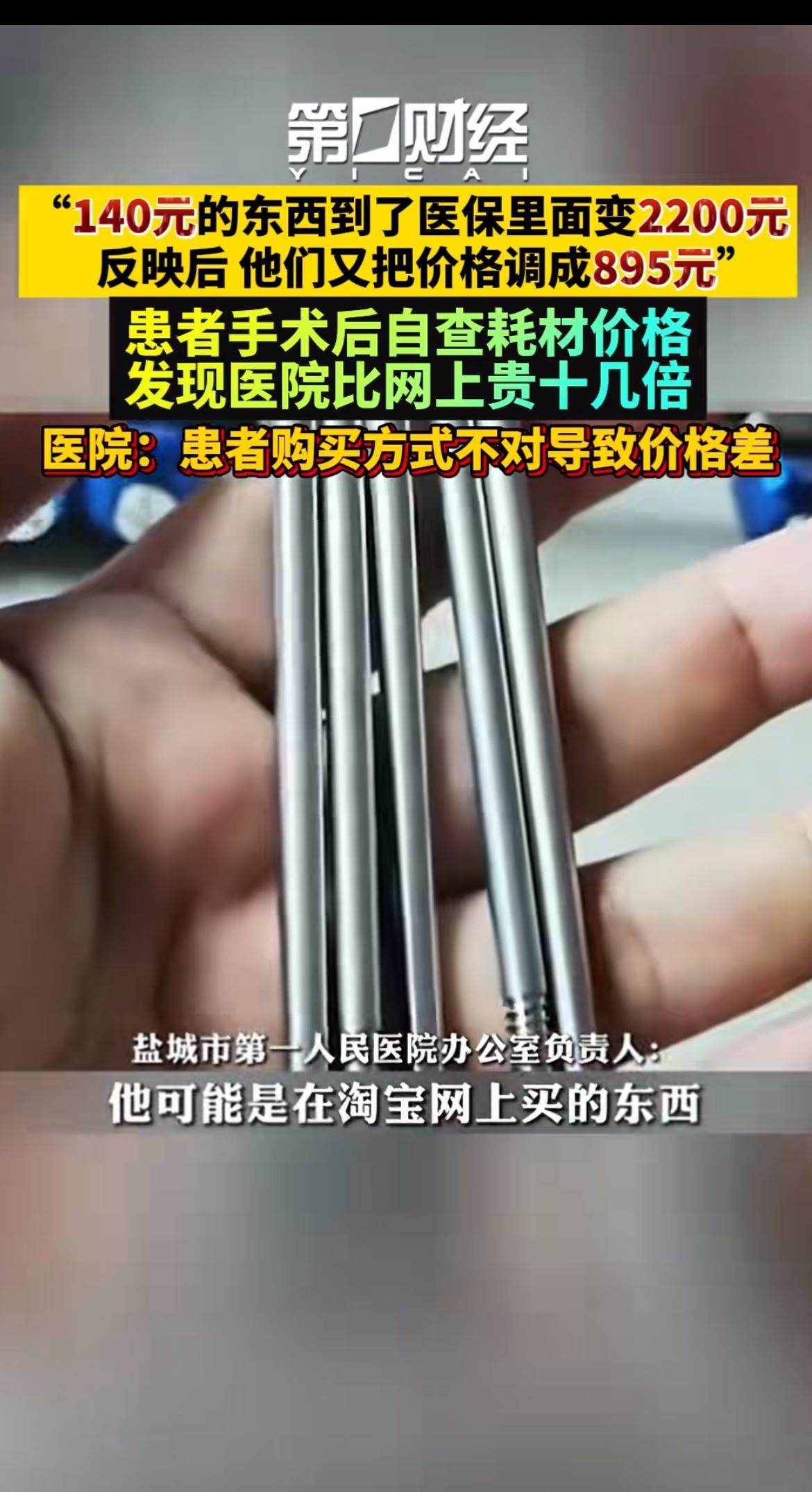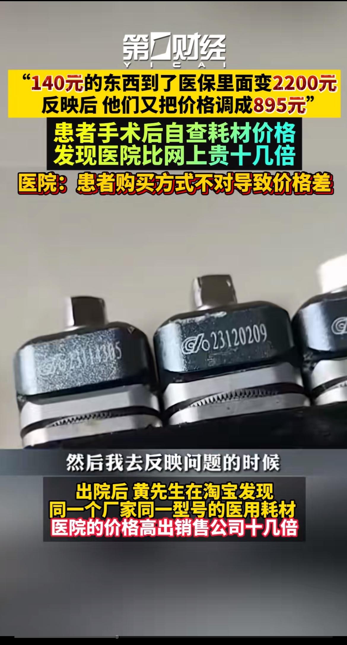 医院收费内幕真的太坑人了!就说江苏盐城的黄先生,腿部骨折在盐城市第一人民医院做手术,费用近8万。术后他发现,医院用的手术医用耗材,和网购平台上同一个厂家的比起来,价格高出十几倍。140块钱的东西到了医保里变2200,他去反映,价格又调成895。还有那骨牵引针和针杆夹,网上骨牵引针一个42元,医院卖483元;针杆夹网上168元,医院卖2200元,都是同一厂家同一型号。医院称渠道不同导致价格差,可患者反馈后价格就改了,这不是价格虚高是啥?现在网购药便宜,大家都爱网购,医院这么搞真让人难以接受。