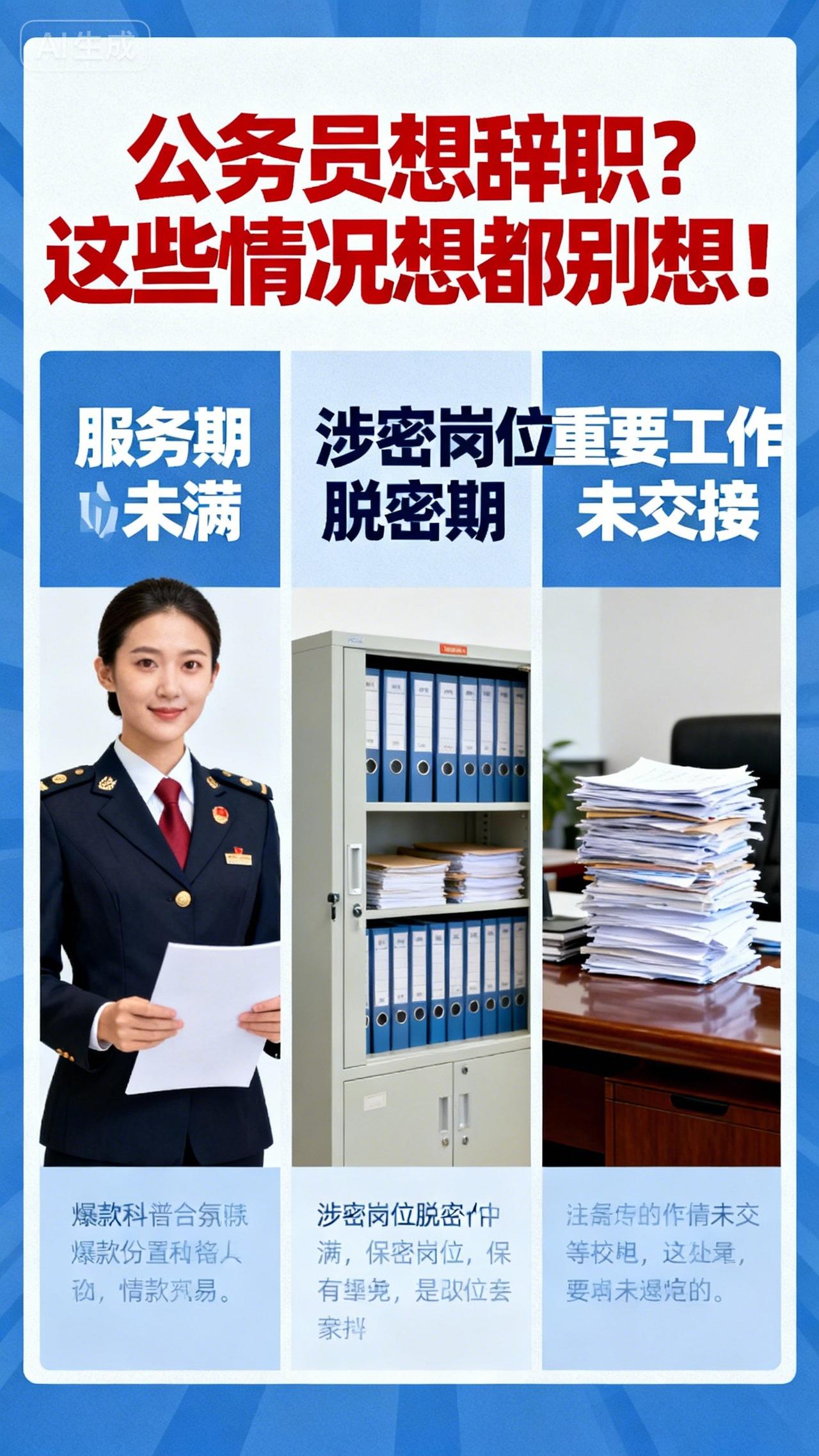 公务员想辞职?这些情况想都别想! 最近,公务员辞职的话题又火了!很多人以为考上公务员就能“铁饭碗”到手,想走就走,但其实,在某些特定情况下,公务员想辞职?门都没有! 首先,没干满最低服务年限的,一律不准辞职! 比如,很多岗位要求必须干满5年,你干了2年就想跑路?对不起,组织不放人!这是为了保证政府工作的连续性,不能让新人刚上手就拍拍屁股走人。 其次,涉及国家秘密的岗位更严格! 如果你在保密部门工作,或者刚调离涉密岗位但还没过“脱密期”(一般是1-3年),想辞职?得先等脱密期结束!毕竟,国家秘密不是儿戏,不能说走就走。 还有几种情况,公务员也不能随便辞职: 1. 正在接受审计、重要公务没处理完的——比如你负责的项目正关键,或者审计组正在查账,你突然要走?不行! 2. 正在被纪律审查、监察调查,或者涉嫌犯罪还没结案的——要是你屁股不干净,想溜?组织肯定先把你的事查清楚! 3. 跟单位签了培训协议的——比如单位花钱送你出国深造,约定服务5年,你干了2年就要走?得赔违约金!不然,就得继续干到合约期满。 最狠的是领导干部!如果你曾经是县处级以上领导,辞职后3年内,不能去原来管辖地区的企业、中介或营利性组织任职,更不能搞相关生意!防止“权力寻租”,避免“旋转门”腐败。 总之,公务员辞职不是想走就能走,国家要确保工作稳定、国家安全、公平公正! 你想辞职?先看看自己符不符合条件吧!辞职 辞职心理 公务员岗位 公务员新政策 职场辞职方式 辞职编制工作 公务员禁忌