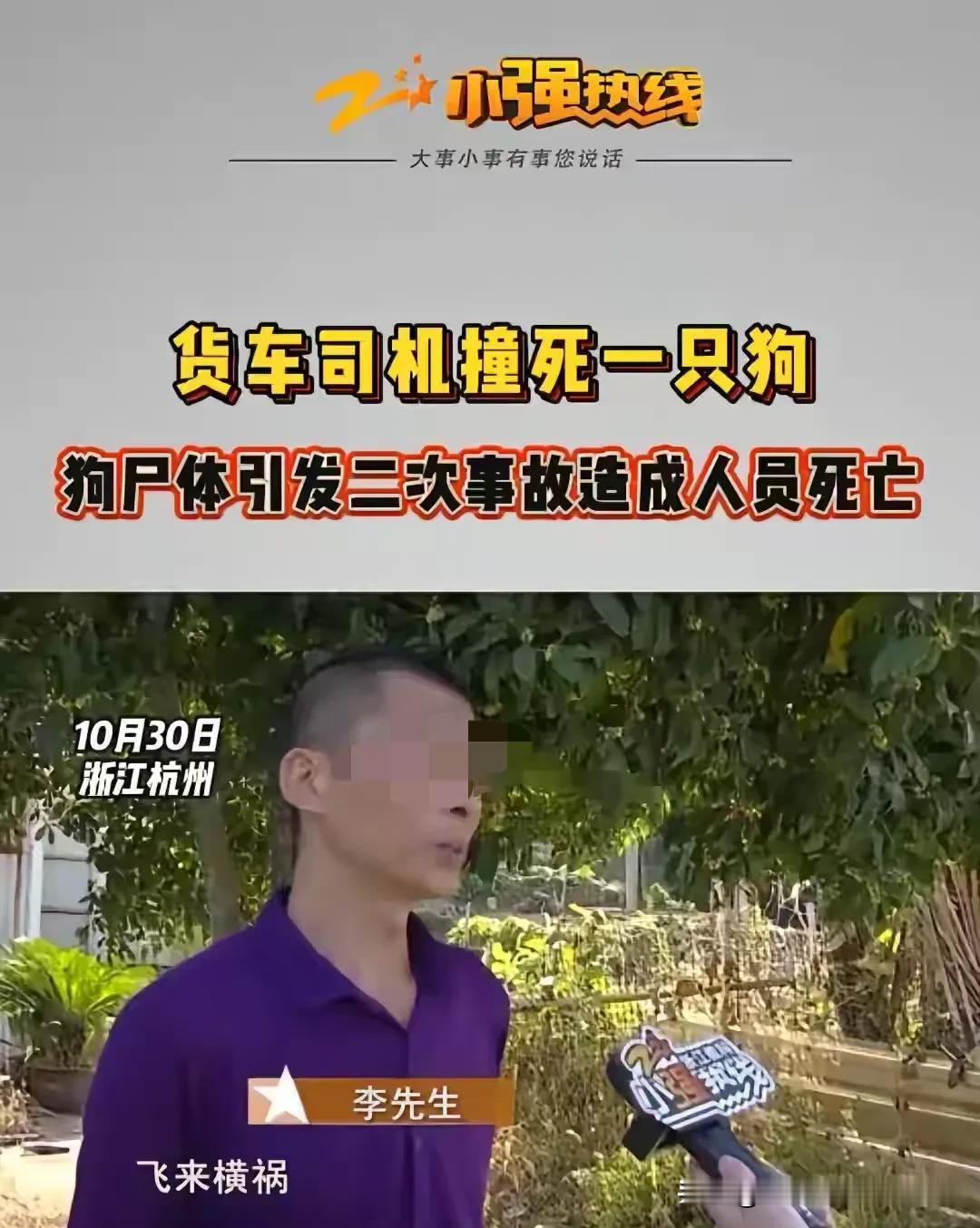 浙江杭州,男子开大货车压死一只野狗,他误以为是石头便直接开走了。谁知来了一辆三轮车又压到野狗发生侧翻,71岁的乘客摔伤后不治身亡。男子在第二天接到交警的电话,说是因为他撞到狗才引发后面的交通事故,需要扣车并承担次要责任。事故认定出来后,男子需承担30%的责任。可男子却说,他并没有把狗撞死,是狗自己跑过去的,遂提起复议!(来源:小强热线) 事情的大致是这样的,据悉男子李某是一名货车司机,在完成运输任务之后,回到家里睡觉。 早上6点多,李某便被手机铃声吵醒,李某看了看手机,是一个陌生的电话号码。 本来李某并没打算打过去,不过看到对方已经给自己打了好几个,还以为是哪一个老板找他送货的,便连忙给回了过去。 谁知,接电话的不是老板而是交警。 对方在核实完李某的身份之后,直截了当的告诉李某,因为他引发了交通事故,需要进行扣车并承担相应的责任。 李某听完直接懵了,他什么时候引发交通事故了? 经过交警的提醒,李某这才想起来。 原来,就在9月25日晚上10点左右,李某开着大货车,正常行驶在一条省道上。 由于已经处于深夜,再加上路上的照明不好,一路上李某始终小心控制着车速。 在行经某一路段时,李某感觉自己明显撞到了什么东西。不过这个东西给自己的感觉很轻微,李某便怀疑是撞到了小石头,没有停车继续行驶离开了现场。 让李某没有想到的是他撞的不是一块小石头,而是一只野狗。 在李某离开后没多久,一辆三轮车经过这里。同样由于证明不佳,三轮车车主没有开清路况,车辆直接压在了野狗身上,导致三轮车侧翻。 三轮车车主没有什么大碍,不过车上的一位71岁的乘客因救治无效死亡。 事故发生之后,交警部门根据该路段的监控录像很快便还原了事故的经过。 由于李某开车将野狗撞死,没有将野狗脱离至路边,导致三轮车车主在这里经过时发生车辆倾倒,从而引发了这场交通事故。 所以交警部门认为,李某的过错与他人的死亡存在因果关系应该承担次要责任,也就是要承担30%的赔偿责任。 李某始终认为自己不存在过错,于是再次查看了当时的监控,结果发现,李某在撞向野狗之后,野狗并没有被撞死,而是自行走了十几米才趴在了路上。 也就是说,李某撞向结构的事故现场,并不是三轮车发生事故的现场。 也正是因为这个原因,李某更不认为自己有过错了,于是便申请了行政复议。 那么从法律的角度,该如何看待这件事呢? 《道路交通安全法》第一百一十九条规定,交通事故是指车辆在道路上因过错或者意外造成的人身伤亡或者财产损失的事件。 李某撞死野狗之后,由于误以为是石头,并没有停车查看,更没有将野狗脱离至路边,导致其他车辆发生了交通事故并造成人身伤亡。 其行为已经符合交通事故的定义,且存在一定的过错,自然需要承担相应的赔偿责任。 交警部门也正是考虑到这一点,让李某承担30%的赔偿责任,并无不妥。 对此你怎么认为呢?关注@胡究法的如法炮制 多学法律少吃亏。