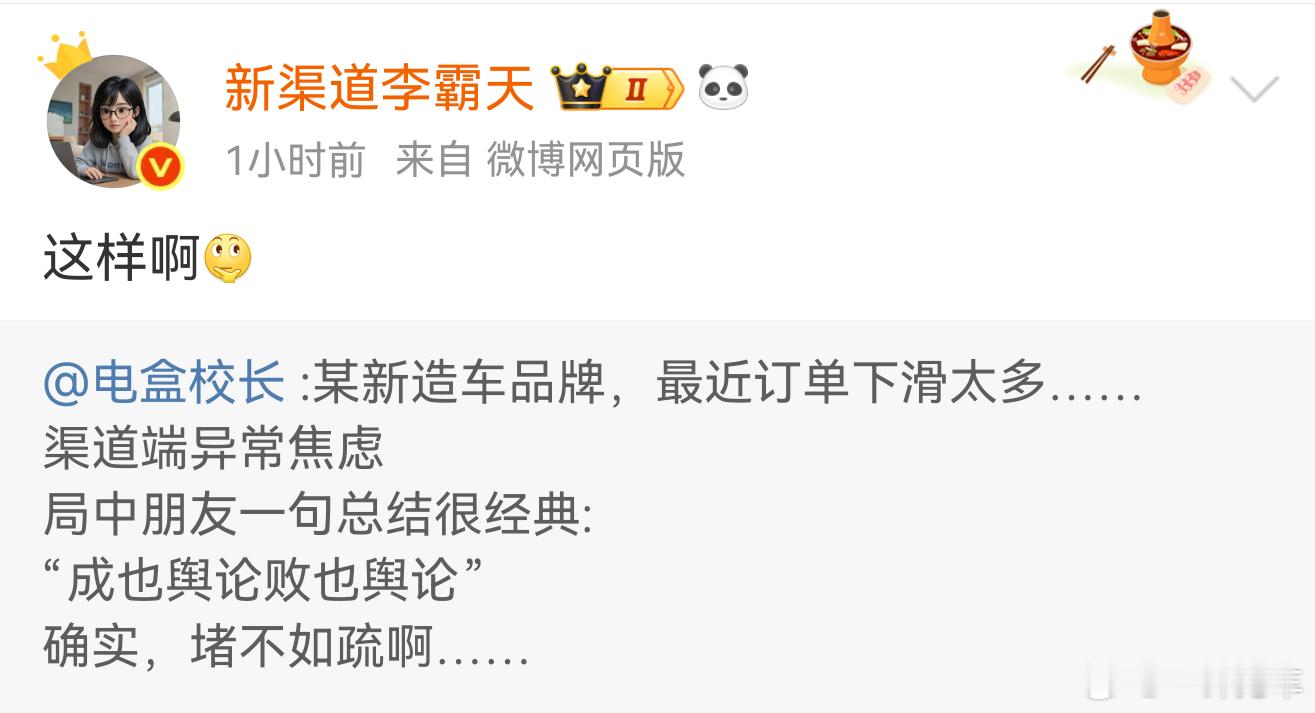 我觉得啊,这话可不能乱说,没有准确依据乱讲订单,等下就被打成“黑公关”了[二哈]。而且不管是那家品牌啊,销售端给点新动作/优惠,说不定订单又上去了呢?谨言慎行~