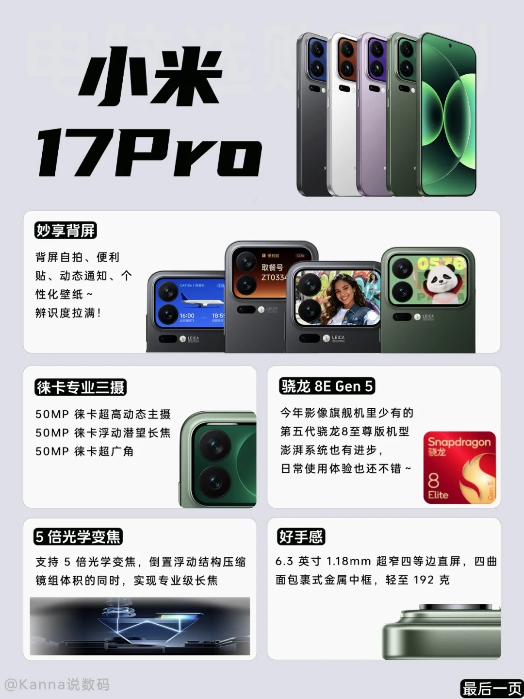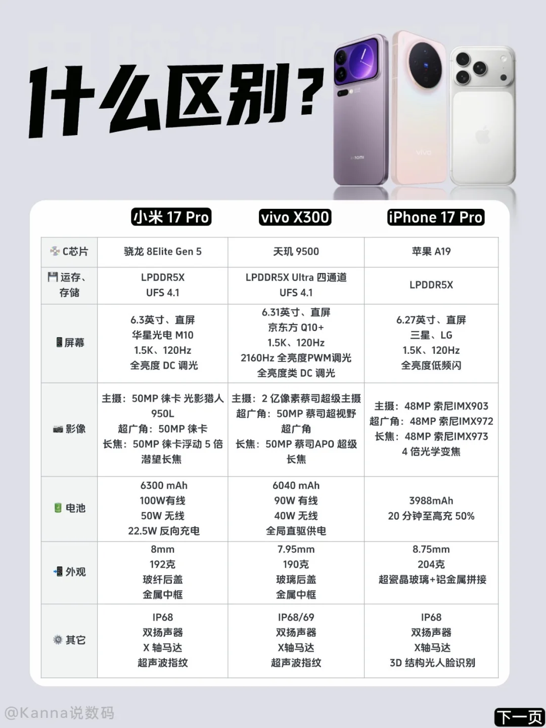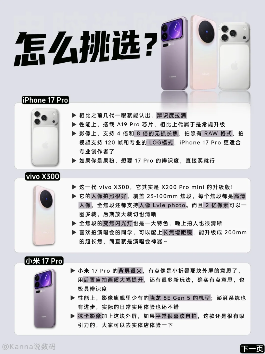 如果你也喜欢小屏手机📱 的精致、好手感,那么下面这三款小屏旗舰机,一定会是你比较纠结的吧 接下来跟大家聊聊这三款机型有哪些特色❓ 分别适合哪些用户❓ 到底该怎么选❓ - 📱 果子17 Pro 今年外观大升级,即使套着手机壳,别人也一眼就能认出这是17 Pro~ 性能上,搭载 A19 Pro 芯片,相比上代属于是常规升级 影像上,📷 支持 4 倍和 8 倍的无损长焦,拍照有 RAW 格式,📹拍视频支持 120 帧和专业的 LOG模式,更适合专业创作者 如果你是果粉,想要 17 Pro 的辨识度,直接买就行 - 📱 vivo X300 这一代vivo X300 也是大升级,它其实是 X200 Pro mini 的升级版~ 你可以把它当作 X300 Pro mini❗️ 它的📷人像拍照很好,覆盖全焦段,每个焦段都是高清人像,全焦段还支持人像 Live photo。而且 2 亿像素可以一图多裁👍,后期放大裁切也清晰 全焦段的变焦闪光灯💡也是一大特色,晚上拍人也很清晰 喜欢拍演唱会的同学,可以配上长焦增距镜,能升级成 200mm等效焦距的超长焦,简直就是演唱会神器~ 如果特别喜欢拍照、拍Live photo、演唱会拍爱豆,那么这款vivo X300 很适合你~ - 📱 小米17 Pro 外观同样大升级,套着手机壳,也能一眼认出这是小米17 Pro 这块背屏很火,有点像是小折叠那块外屏的意思了,用后置自拍画质大幅提升,还有很多新玩法,确实有点意思,也极具辨识度 性能上,影像旗舰里少有的骁龙 8E Gen 5 的机型;澎湃系统也有进步,实际的日常体验也还不错 徕卡影像加上这块外屏,如果平常很喜欢自拍,这款还是很有吸引力的,大家可以去实体店体验一下 - 最后简单总结一下: 1️⃣ 果粉想要新外观就选果子17 Pro 2️⃣ 喜欢个性化的外屏,就选小米17 Pro 3️⃣ 特别喜欢拍照、拍Live photo、拍vlog、拍演唱会等等,我会更推荐选择 vivo X300