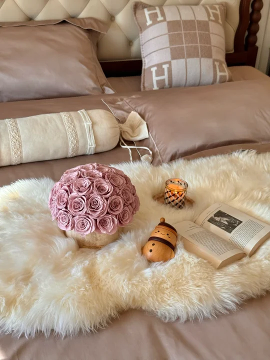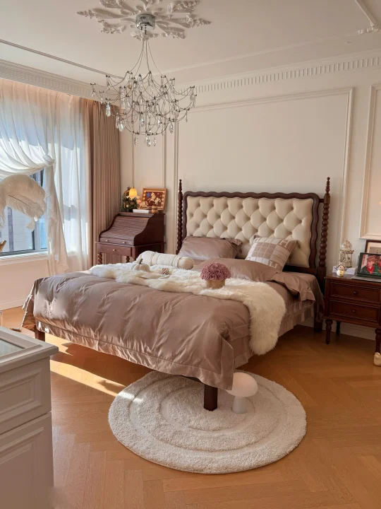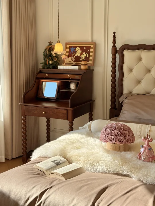 暖冬宅家记🎀 藏在法式窗棂里的圣诞氛围🌲 新换的四件套很舒服,亲肤的面料,裹着阳光晒过的柔软,像给睡眠裹了层云朵⛅️ 很喜欢胡桃木色系的家具,夏克床和风琴梳妆台很有美式高级感,床头上摆放着我喜欢的挂画和雪人摆件,最妙的这个小雪人,圆滚滚的肚子藏着玄机,掀开帽子是牙线收纳盒,捏紧胖乎乎的手,顶部竟弹出启瓶器,好实用~ 黄洞石永生花和我的家也超配的,摆在那里都好看 不必奔赴热闹,宅家的时光才最珍贵。把法式浪漫揉进日常,这便是圣诞最好的礼物⭐️ -