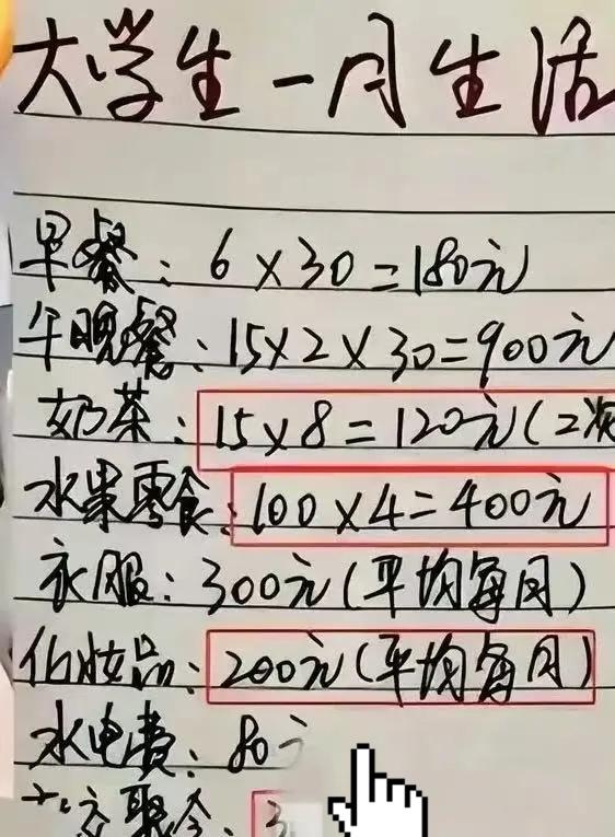 1500元大学生活费引发骂战:是不够花还是不会花? “每月1500元生活费根本活不下去!”某大学女生的哭诉近期刷屏网络,可她晒出的消费清单却让网友集体“炸锅”。一边是女生吐槽加根2元香肠都要犹豫,一边是清单里每月8杯奶茶、400元水果的“小资配置”,这场争议背后,藏着两代人消费观的激烈碰撞。 女生的账单明细透着矛盾:早餐6元、午晚餐各15元,30天餐饮支出达1080元,占总生活费七成以上;再加上每月8杯15元的奶茶、400元水果零食,仅饮食相关开销就已超出1500元底线。更别提每月300元衣服、200元化妆品和300元聚会费用,各项开支叠加后,1500元自然捉襟见肘。但网友的质疑也一针见血:大学食堂15元能吃丰盛荤菜,10元以内就能解决一餐;奶茶并非刚需,水果每月几十元足以满足需求,过度追求精致生活难免超出普通家庭承受范围。 这场热议的核心,早已不是生活费数额多少,而是年轻人消费观与家庭经济条件的适配问题。对于普通家庭而言,1500元已能保障大学生基本生活,额外的奶茶、高频次聚会、每月添新衣等开销,本就该量力而行。父母的收入或许是省吃俭用攒下的,当女生纠结要不要加2元香肠时,更该思考那些非必要开支是否合理。其实,钱不够花并非无解,勤工俭学既能补贴生活费,也能体会赚钱不易;调整消费结构,减少非刚需支出,1500元完全能过得体面又充实。 消费自由的前提是经济独立,大学生活的核心是成长与学习,而非过早追求超出能力范围的精致。当我们在校园里计较一杯奶茶、一次聚会的开销时,不妨多体谅父母的辛劳,学会在约束中规划生活。毕竟,真正的独立从不是向父母索取更多,而是懂得量入为出、对自己的消费负责。你觉得大学生每月多少生活费合适?欢迎在评论区分享你的看法。大学生活费