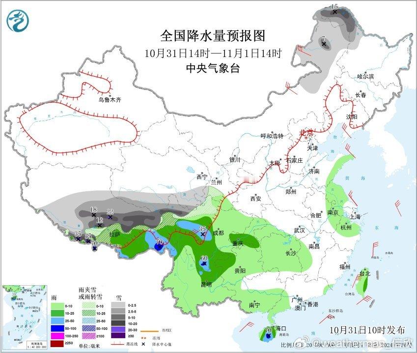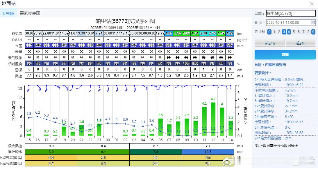 【降水】今天08-14时西藏中东部、云南西北部、四川西部和南部、贵州中北部、海南、山东南部等地出现降水。西藏部分高海拔站点出现降雪。帕里降水量19.7毫米,雪为主,但降雪不明显,12时积雪2厘米,14时降雪为0,因为温度不是很低,化掉了。