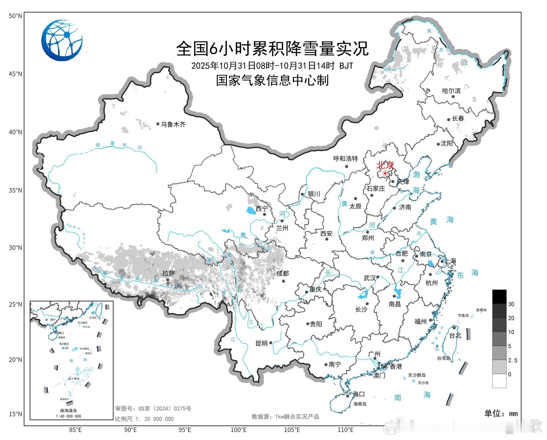 预计,今天下午到明天中午,西藏中东部和南部、青海南部、川西高原北部以及内蒙古东北部、黑龙江西北部等地有大到暴雪。其中西藏中部局地有大暴雪,西藏南部局地有大暴雪-特大暴雪(30-35毫米)。上述地区新增积雪4-8厘米,山区局地15厘米以上。