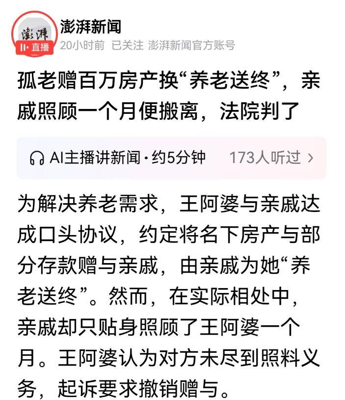 上海,王阿婆无儿无女,晚年孤身一人。她希望找一份亲情依托,便将自己价值数百万的房产及42.8万元存款赠与侄女一家,换取“养老送终”的承诺。然而,房产到手后,侄女一家仅同住28天便离开,从此不再照顾。老人无奈起诉,希望收回财产。最后法院判了。 王阿婆年轻时与丈夫恩爱有加,生活富足。唯一的遗憾,是膝下无子女。老伴去世后,她孤独地生活在那套熟悉的房子里,行动渐渐不便。她看着邻居家的老人有儿孙照料,心里常常发怵。她开始担心:“如果哪天我起不来了,连口水都没人端怎么办?” 在多番思虑后,王阿婆想到自己还有一个侄女王女士,是兄长的女儿。两人平日来往不多,但王女士性格爽快,曾主动表示会照顾姑姑。于是,王阿婆决定以房产和存款为“养老保障”,换取侄女的照顾。 2024年4月,双方在家中达成口头协议:王阿婆将房屋过户至侄女的儿子小王名下,并将42.8万元存款转入侄女账户。侄女承诺搬入照顾王阿婆,承担生活起居费用,直至老人去世,并负责料理后事。那一刻,王阿婆觉得自己找到了依靠。 然而,现实很快打破了幻想。王女士一家搬入仅28天,就以“生活习惯不同”为由离开。此后再未照料老人。房产和存款已全部转出,老人却再度陷入孤独。她反复拨打侄女电话无人接听,只能叹气说:“房子没了,钱也没了,连个说话的人都没了。” 在多次沟通无果后,王阿婆向法院提起诉讼,要求返还房产与存款。她认为,这笔赠与是附条件的,侄女既然没有履行赡养义务,就应撤销赠与。 侄女王女士在庭上辩称,自己当初出于“善心”照顾姑姑,已经尽力。她解释:“姑姑脾气古怪,怎么做都不满意,我一家人都受委屈。”她同时表示,老人只是希望她帮忙料理后事,并未约定长期赡养。 案件审理中,法院查明事实:王阿婆在赠与前后身体健康、意识清晰,侄女一家确实搬入并照料过,但时间极短。双方虽未形成书面协议,但有邻居证言证明,王阿婆曾公开表示“把房子给侄女一家养老送终”。 法院认为,双方虽为口头约定,但符合《民法典》第657条关于赠与合同的定义——赠与人将财产无偿给予受赠人,受赠人表示接受的行为即视为合同成立。此赠与行为同时附有义务,即受赠人须履行“养老送终”责任。 法院指出,侄女一家仅照顾老人28天便离开,明显未履行赡养义务,且赠与目的未实现,构成撤销条件。遂判决撤销赠与,要求返还房产及部分存款。 考虑到侄女在照顾期间确实承担部分生活费用,法院酌情扣除,最终判令返还房产及存款25万元。 一审宣判后,小王提起上诉,辩称赠与仅是为“身后料理后事”,并非长期赡养。二审法院维持原判,认为此说法与常理不符:“若仅为身后之事,不可能立即过户房产及转账存款。” 二审判决明确指出,王阿婆的赠与属附义务赠与合同。侄女一家既然收受财产,就应履行义务。既未照顾老人,也未履行“生养死葬”,赠与目的落空,依法应撤销。 从法理上看,本案兼具警示与启示意义:首先,附义务赠与合同具有法律约束力。赠与人将财产附条件转让,受赠人应履行义务,否则赠与人有权撤销。《民法典》第663条赋予赠与人撤销权,其时效为自知晓撤销事由起一年内。王阿婆在侄女离开后立即起诉,符合时效规定。 其次,口头协议虽缺乏书面证据,但可通过其他证据补强。法院综合邻居证言、银行转账记录、房产过户时间,确认双方存在“以赡养换财产”的真实意思表示,因此合同有效。 再次,本案体现了公平原则与公序良俗的司法考量。若侄女一家以短期照顾换取数百万财产,明显违背公平。法院判决撤销赠与,是对弱势老年人权益的司法保护。 值得注意的是,本案也暴露了现实中的法律盲区:许多老人缺乏法律意识,未签订书面协议或见证文件,容易在纠纷中陷入被动。若王阿婆未能及时维权,可能永远失去财产。 在社会层面,这起案件不仅是一起家庭赡养纠纷,更折射出老龄化社会下的伦理困局。越来越多的老人希望通过“以房养老”换取照料,却忽视了法律程序的重要性。 从王阿婆的角度看,她以信任换安全,却因口头约定失去了依靠。从法院的角度看,判决不仅是对个案的裁决,更是对社会的提醒——法律不能替代亲情,但可以防止亲情被滥用。 如今,王阿婆的房子与存款已依法返还。她说得最平静的一句话是:“我不是怕没钱,我是怕到老了没人管。”