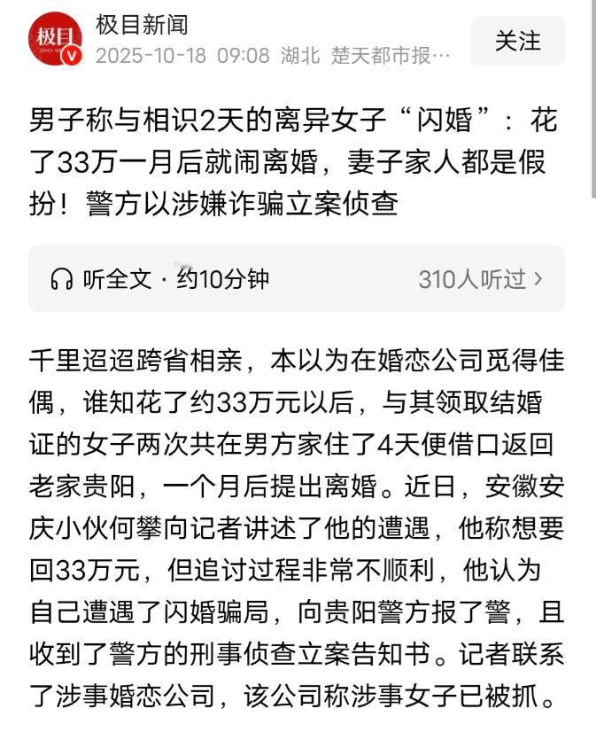 安徽,一场仅认识两天的“闪婚”,让29岁的何攀付出了33万元的代价。婚后妻子两次回家总共待了四天,只同房一次,一个多月就提出离婚。更离奇的是,女子的“家人”全是假扮的,她本人竟是有两段婚史、一个孩子、还因吸dú被抓过三次的惯犯。何攀报警后才知道,自己掉进了一个精心设计的骗婚陷阱。如今,骗子被抓,但还有17万元的彩礼和“五金”迟迟未追回。 何攀是安徽安庆人,常年在温州打工。因为年近三十还没成家,家里人也急,他自己也想着早点结婚。恰在这时,一个安徽老乡联系上他,说自己在做婚介生意,有合适的对象。老乡信誓旦旦地保证:“这姑娘老实本分,离过婚但条件不错。” 何攀半信半疑,但在渴望婚姻的心理驱使下,还是回了老家。4月20日,在贵阳一家婚恋公司安排下,他第一次见到了陆女士。陆女士看上去温柔得体,说自己“父母早逝、独自生活”,还表示想找个能依靠的男人。两人一拍即合,当场签下了所谓的“订婚前合同”。何攀交了12万元彩礼。 陆女士很快又提出要“五金”,何攀一咬牙答应了。同时,他还向婚恋公司支付了3万元服务费,又给几名“红娘”付了10.6万元好处费,另加1.8万元谢媒费。短短两天,他花了15.4万元中介费用。 仅仅认识两天后,4月22日,何攀和陆女士在婚恋公司的见证下领了结婚证。此时他们连彼此的生日都没完全记住。何攀坦言:“那时候只想着终于有人愿意嫁给我。”可他没想到,这段婚姻刚开始就走向了陷阱。 领证后,陆女士只在他家住了两天,就说要回贵阳办事。何攀以为妻子真有事,便没多问。几天后,她又回来,在家待了两天,再次离开。这是他们婚后的全部共同生活。直到5月30日,陆女士突然提出离婚,理由是“路途太远,不想两地分居”。 何攀这才醒悟:他们从领证到提出离婚,不到40天。期间只同房一次,感情基础几乎为零。于是他赶去贵阳想问个明白。婚恋公司调解时,陆女士态度冷淡,坚持离婚,对何攀要求退钱的事含糊其辞。何攀一怒之下表示:“离可以离,但钱得退。” 陆女士一开始口头同意,随后又“失联”。何攀再联系婚恋公司,却发现门已上锁,贴着“退租公告”。他又赶到陆女士口中的“姑姑家”,结果对方承认自己是被雇来假扮姑姑的,根本不认识陆女士。至此,何攀彻底明白:这一切是圈套。 他报了警。警方介入后发现,陆女士早有两段婚姻史,并育有一子。她曾三次因吸dú被拘,还多次以结婚为名骗取他人钱财。婚恋公司在介绍时未做任何背景审查,甚至疑似与她串通骗取财物。 根据警方调查,何攀在整个“婚事”中共支出约33万元。其中,婚恋公司及红娘收取的15.4万元中介费,经调解部分退还;陆女士收取的彩礼、五金等共17万元未退还。警方以诈骗罪立案侦查,9月21日将陆女士抓获。 那么,从法律角度看,何攀这33万元的钱该不该退?婚恋公司和陆女士各应承担什么责任? 首先,陆女士的行为构成了以婚姻为名实施诈骗。依据《刑法》第266条规定,诈骗公私财物,数额巨大或者有其他严重情节的,处三年以上十年以下有期徒刑,并处罚金。本案中,陆女士以虚构身份结婚,骗取彩礼与其他费用,金额高达17万元,属“数额巨大”,足以构成刑事犯罪。 其次,婚恋公司及红娘若在明知或应当知道陆女士提供虚假信息的情况下仍促成婚姻,属于未尽审核义务,应承担民事赔偿责任。《民法典》第116条规定:因第三人过错造成他人损害的,被侵权人可选择请求第三人或直接侵权人承担责任。这意味着,何攀可要求婚恋公司与陆女士承担连带赔偿责任。 至于退费协议中“不得再追究民事或刑事责任”的条款,根据《民法典》第506条,该条款限制受害人合法权利,属无效条款,法院不会予以支持。 再看彩礼问题。《最高法关于审理涉彩礼纠纷案件的若干意见》指出,若双方未实际共同生活或婚姻持续时间短,受赠方应当退还彩礼。陆女士与何攀婚后仅共同生活4天,显然符合退还条件。何攀有权起诉要求退回17万元彩礼及相关损失。 在形式上,陆女士与何攀的婚姻真实存在,但她从始至终以“骗钱”为目的,具备刑法上的“非法占有目的”,因此属于刑事诈骗,而非单纯的民事纠纷。 警方的立案也说明,该案已超出婚姻范畴,进入刑事侦查阶段。陆女士最终或将被追究刑责,并需退赔何攀的损失。 在案件侦破后,何攀坦言:“现在只希望钱能拿回来,也算给自己上了一课。”而警方也提醒公众——凡涉及金钱往来的婚介,应核实对方身份、婚姻状况、信用记录,必要时签署明确合同,留存证据。