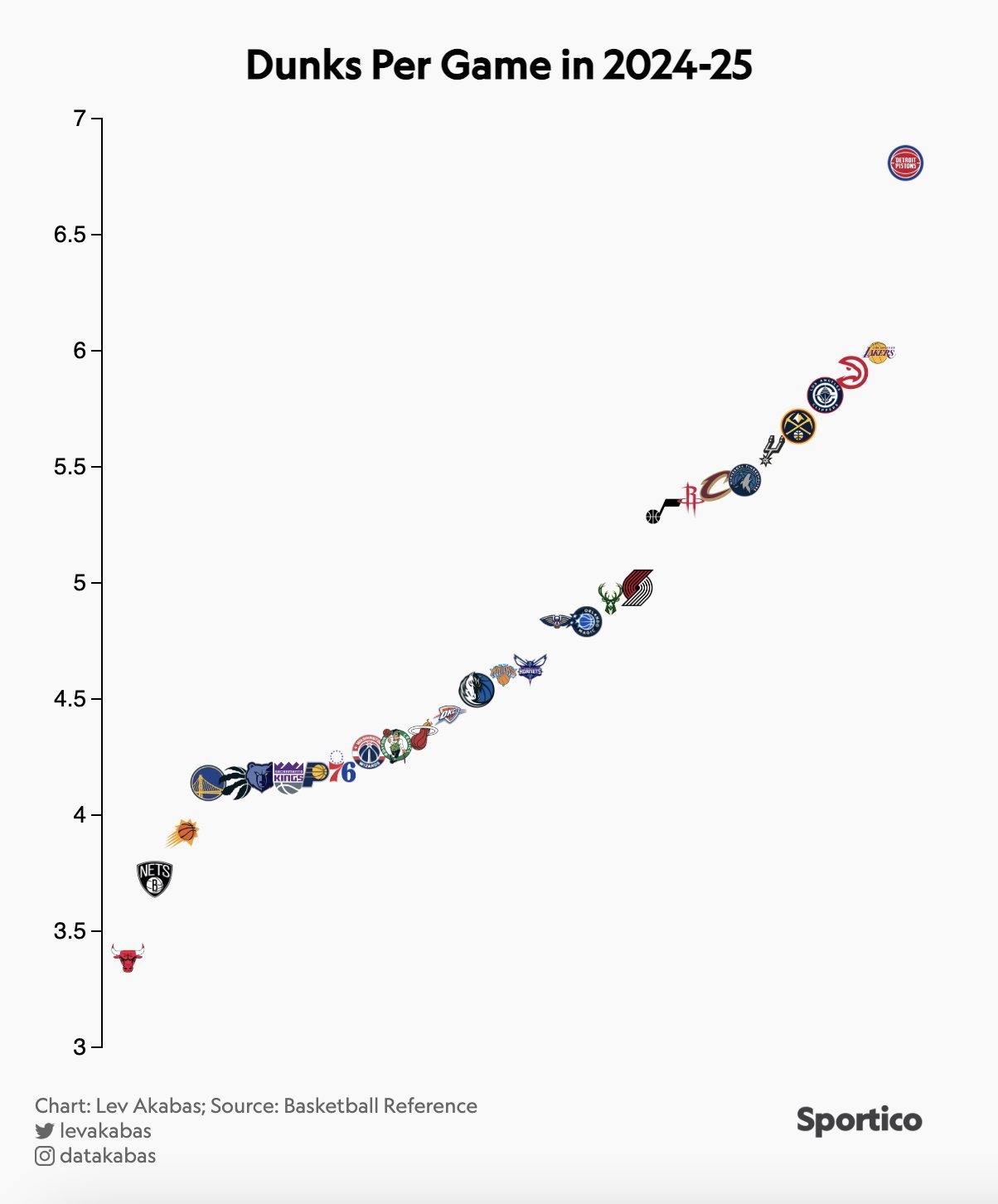 上个赛季底特律活塞的场均扣篮数据遥遥领先NBA