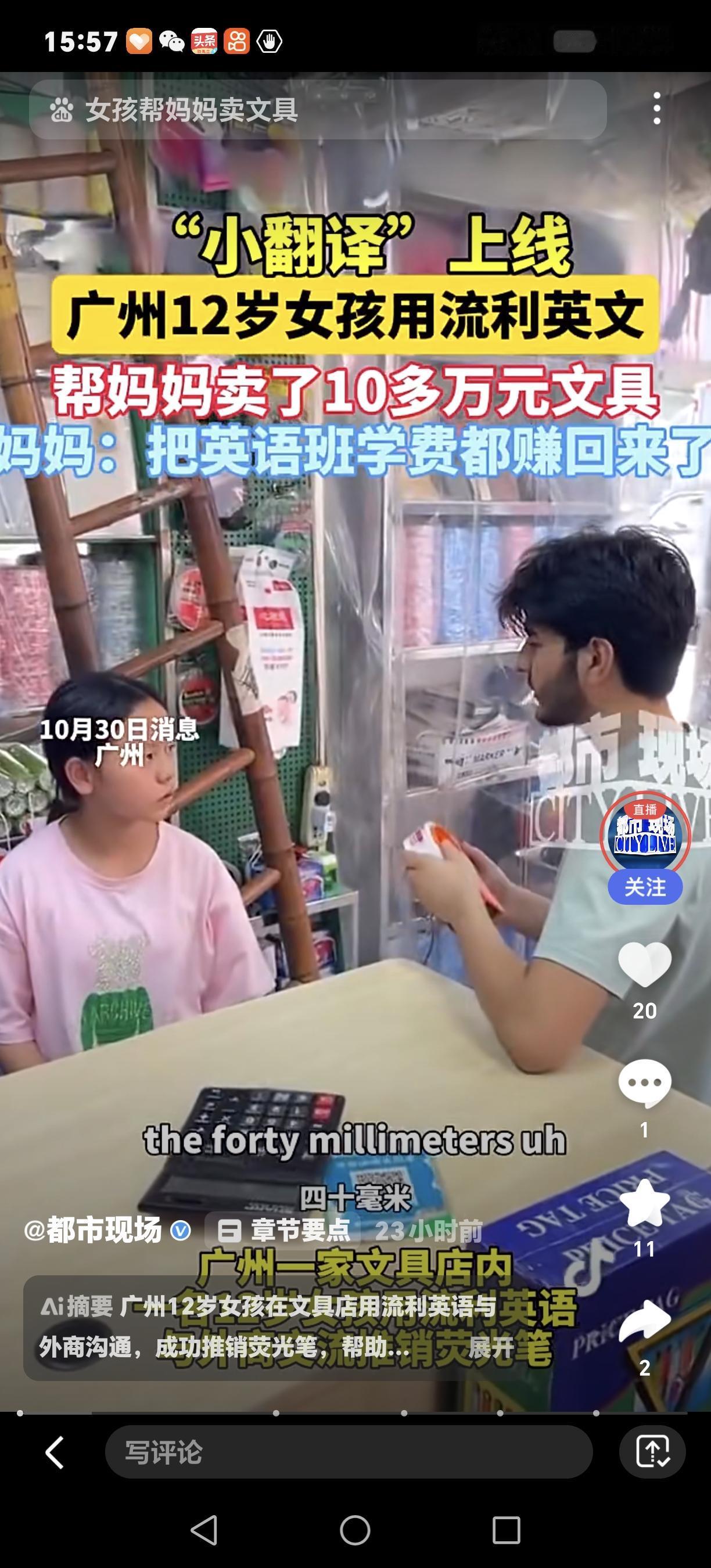 12岁女儿,用流利英语帮妈妈卖文具,赚超10万!妈妈:把英语学费都赚回来啦!10月24日,广州一家文具店内,一名12岁女孩,用流利英语,与外商交流推销荧光笔的视频在网上走红。 这不是普通的“帮忙卖东西”,而是一场关于天赋与努力,完美结合的精彩演绎。视频中,那位笑容灿烂、用英语娓娓道来的小女孩,不仅让人感受到她的自信和从容,更让无数家长心头一震:原来教育的真谛,不仅仅是书本上的知识,更是激发孩子无限潜能的艺术。 你或许会问:“一个12岁的孩子,怎么能用流利的英语推销文具?”答案其实很简单——她的背后,是家长的用心培养,是每天坚持的积累,更是她对未来的无限渴望。她用英语介绍商品的那一刻,不只是卖货,更是在用行动告诉我们:只要有梦想,年龄从不是限制。 更令人动容的是,视频中的那份自信和专业,竟然让她在短短几天内,赚取了超过10万元的收入!这笔“意外之财”,不仅让妈妈笑得合不拢嘴,更让所有人看到了一个普通家庭通过教育和努力,创造奇迹的可能。妈妈笑着说:“把英语学费都赚回来啦!”这句话背后,是无数家长心底的共鸣:孩子的未来,远比我们想象的要宽广得多。 这件事,引发了广泛的讨论:我们是否还在用传统的方式教育孩子?是否应该给他们更多展示自我的舞台?其实,孩子的潜力无限,只要我们愿意相信、鼓励和引导。这个故事告诉我们:学习,不仅仅是为了应付考试,更是为了打开世界的窗户,让孩子在全球化的浪潮中自信前行! 更重要的是,这个故事也让我们反思:在这个快节奏、竞争激烈的社会,孩子的能力和勇气,才是真正的“硬核竞争力”。他们,用自己的行动证明:只要敢于尝试,勇于表达,就能创造奇迹。 所以,亲爱的家长们,别再担心孩子学得慢或不够“标准”。给他们一个机会,让他们用自己的方式去探索、去尝试,也许下一次,你会看到一个用英语推销文具、赚得盆满钵满的小天才在你面前闪耀。毕竟,未来属于那些敢于梦想、敢于行动的孩子们,而我们,唯一要做的,就是成为他们最坚强的后盾。 这个故事,还在继续,你准备好为你的孩子点亮那一盏梦想的灯了吗?让我们一起相信:每一个孩子,都值得拥有一个无限可能的未来! 小学生赚钱方法 小学生卖货