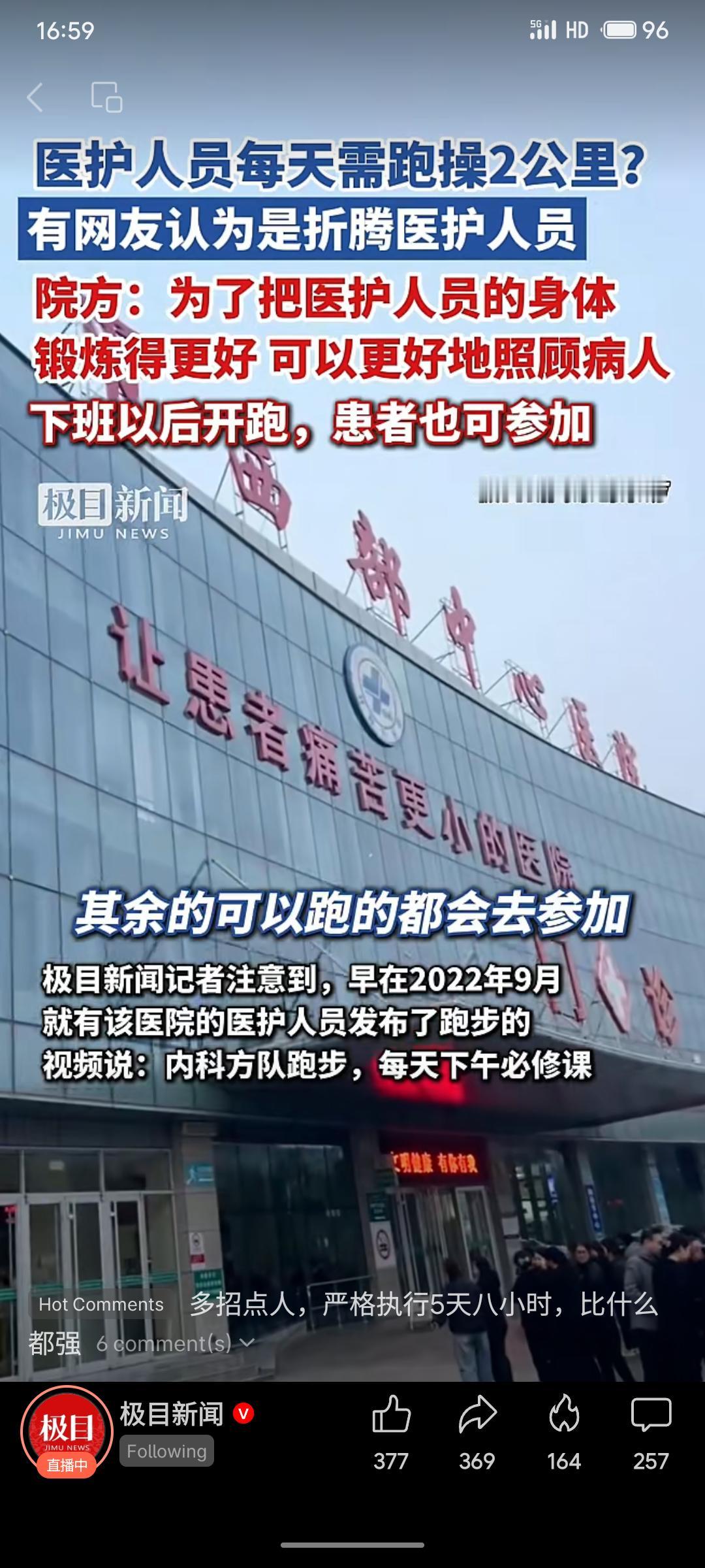 石家庄某医院要求医护人员每日跑操2公里,引发网友质疑,认为此举是“折腾”医护。院方回应称旨在锻炼员工身体,以更好服务患者,活动安排在下班后,患者亦可参与。有网友建议应优先增加人手、落实8小时工作制。