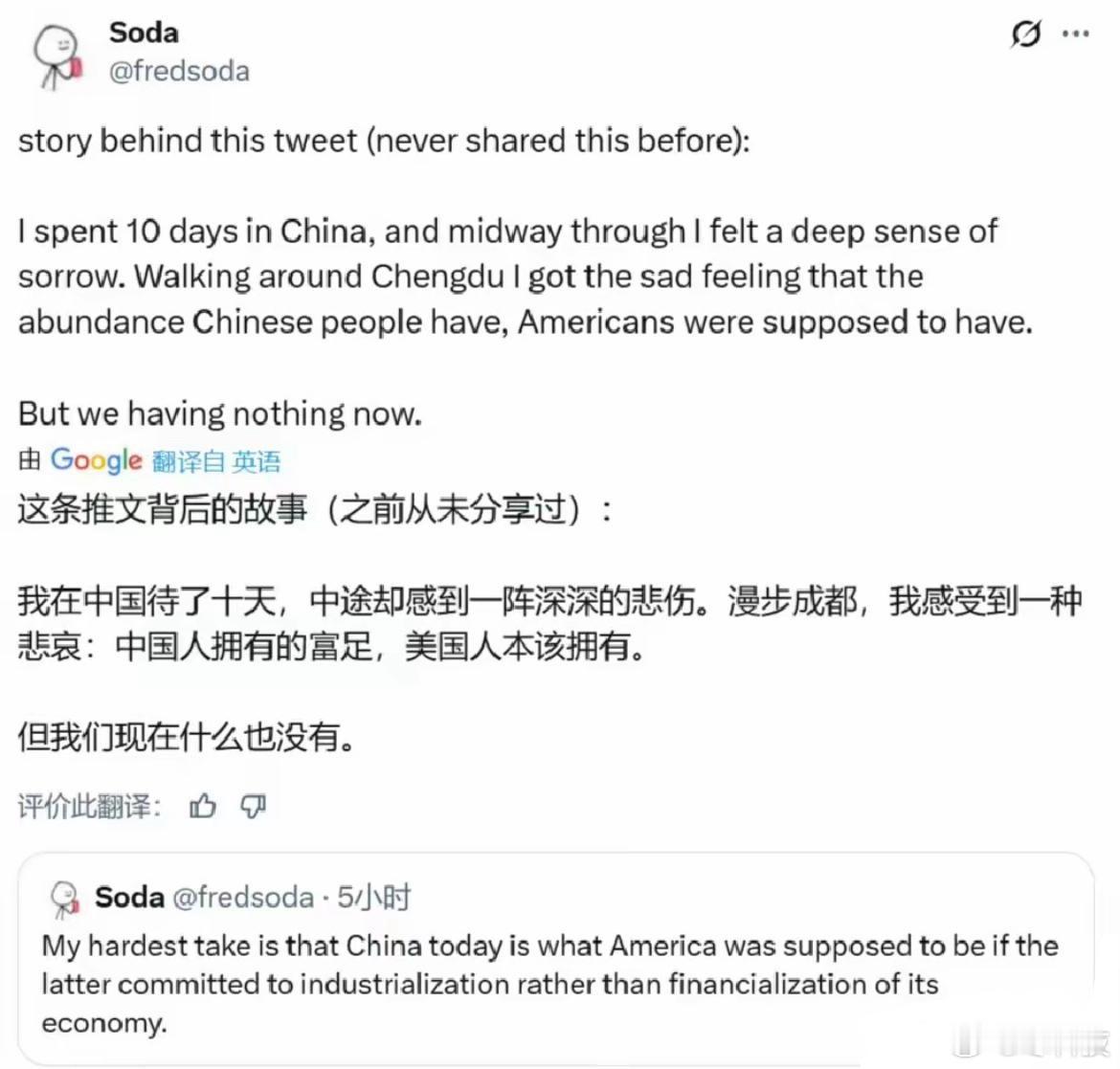 一位洛杉矶的美国人初次来华后发帖:在中国待了十天,某天突然涌上一阵深切的难过。走在成都的街头,心里堵得慌——中国人现在过的这种踏实富足的日子,本该是美国人也能拥有的,可我们如今手里啥都没有。
