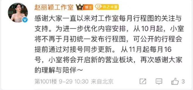继赵丽颖之后,女演员虞书欣和邢菲工作室宣布取消艺人每月行程图,之后取消行程图的艺人会越来越多,到时候明星的线下活动就像开盲盒一样,隐私性会越来越好。