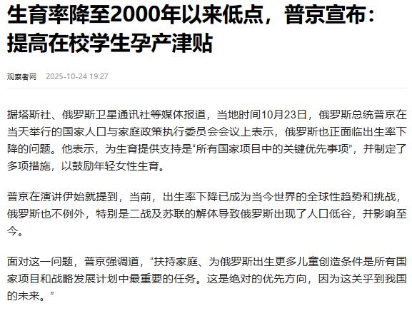 最近战斗民族的生育政策直接炸翻全网,总统普京开大会时放话,以后俄罗斯家庭生三个及以上孩子得是常态,但让人没想到的是,为了让大家愿意多生娃,俄罗斯竟直接甩出“钞能力+超强福利”,这波操作简直卷到飞起。 谁能想到敢打敢拼的俄罗斯,现在最头疼的是“人不够用”,2024年出生人口才122.2万,创下24年来的最低纪录。 相比之下,去世的人却有182万,一年就净减60万。更让人揪心的是,从2018到2023年,常住人口从1.45亿跌到1.43亿,7年少了160万,算下来每天都有3所学校因为没学生而关门。 西伯利亚鄂毕河畔的老村长伊万诺夫最有感触。他守着的村子2018年还有327口人,如今只剩48位老人。“年轻人全去大城市讨生活了,去年最后一所学校关张时,孩子们抱着课桌哭。” 这种场景在远东地区不算新鲜,已有1.1万个村庄彻底从地图上消失,北极地区10年人口减了40%,边疆的土地都快没人守了。 工厂里更是缺人。远东的木材厂老板愁得睡不着,原本该有50人的车间只剩28人,订单堆成山却开不了工。官方统计显示,全国劳动力缺口高达1000万,连莫斯科的外卖员都成了紧缺职业。 为了让人愿意生,俄罗斯拿出了“钞能力”。在校女大学生怀孕就能领10万卢布补贴,学校还得配母婴室和托育班,生完甚至能优先答辩。 对普通家庭更实在:2026年生育津贴最高能拿95.5万卢布,到2028年还要涨到118.8万,相当于普通工人14个月的工资。多孩家庭买房更划算,房贷利率超过6%的部分国家全给补。 除了给钱,政策还管到了生活细节。职场妈妈的产假也升级了,生多胎能休194天,期间每月能领平均工资的40%。鞑靼斯坦给多孩家庭发免费农机具,楚科奇用狩猎许可证激励生育,国家还计划3年内新增15万个托儿所名额。 消失多年的“英雄母亲”称号也回来了,生10个以上孩子的女性能拿100万奖励,还能去克里姆林宫赴宴。 可这些福利没能完全打动年轻人。莫斯科社会研究院的调查显示,超过60%的女性说短期内不考虑生孩子,只有12%的家庭觉得补贴是生育的关键。 28岁的程序员伊万说出了实情:“养个孩子每月要花3万多卢布,我的工资刚够付房租,就算给补贴,后续的花费也扛不住。”官方数据也证实,住房成本占了普通家庭收入的42%,育儿嫂月薪比白领还高。 更让人无奈的是,有些提议还引发了反感。有议员说“别让女孩上大学,免得耽误生育”,还有人建议“半夜断网逼年轻人造人”,这些话让年轻人更抵触。 2024年11月通过的法律禁止宣传无子女主义,最高罚40万卢布,可社交平台上全是反对的声音:“不是不想生,是养不起啊。” 其实俄罗斯早就在努力了。2007年就推出“母亲资本”计划,生二胎能领61万卢布,还能用来还房贷,可出生率只是短暂回升,2017年后又掉了下来。现在总和生育率只有1.83,远没达到维持人口平衡的2.1。专家算了笔账,照这速度,三百年后俄罗斯可能就没人了。 如今莫斯科的幼儿园招生处还是冷清,圣彼得堡的年轻夫妻依旧在犹豫。普京在会上说“国家不会施压,只会帮忙”,可从10万卢布补贴到房贷优惠,这些政策能不能暖透年轻人的生育焦虑,还是个未知数。 毕竟对普通人来说,敢生孩子的底气,从来不止是一时的补贴,而是能看得见的安稳生活。