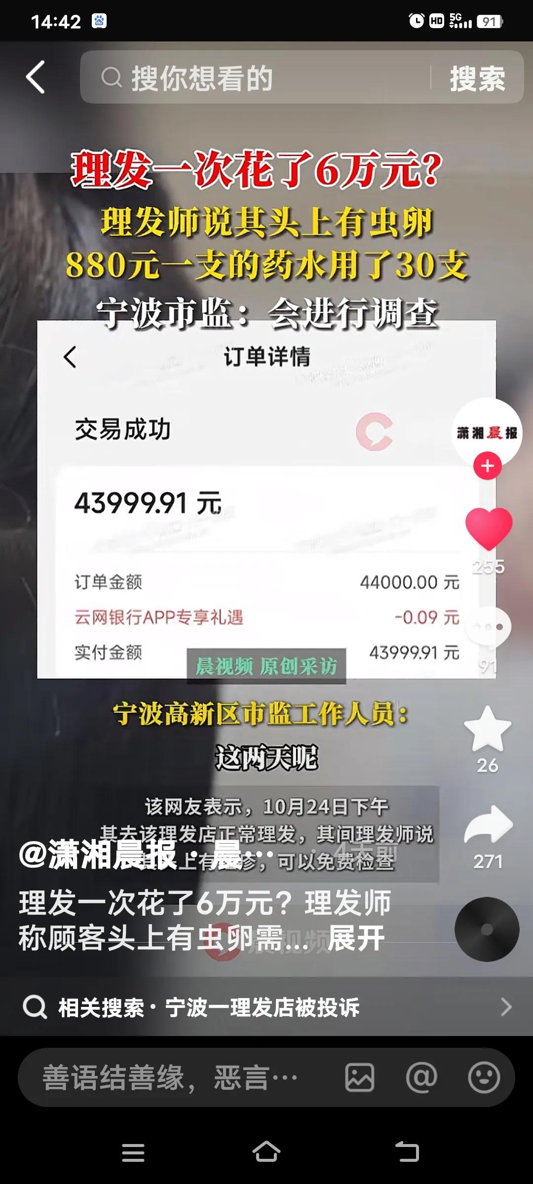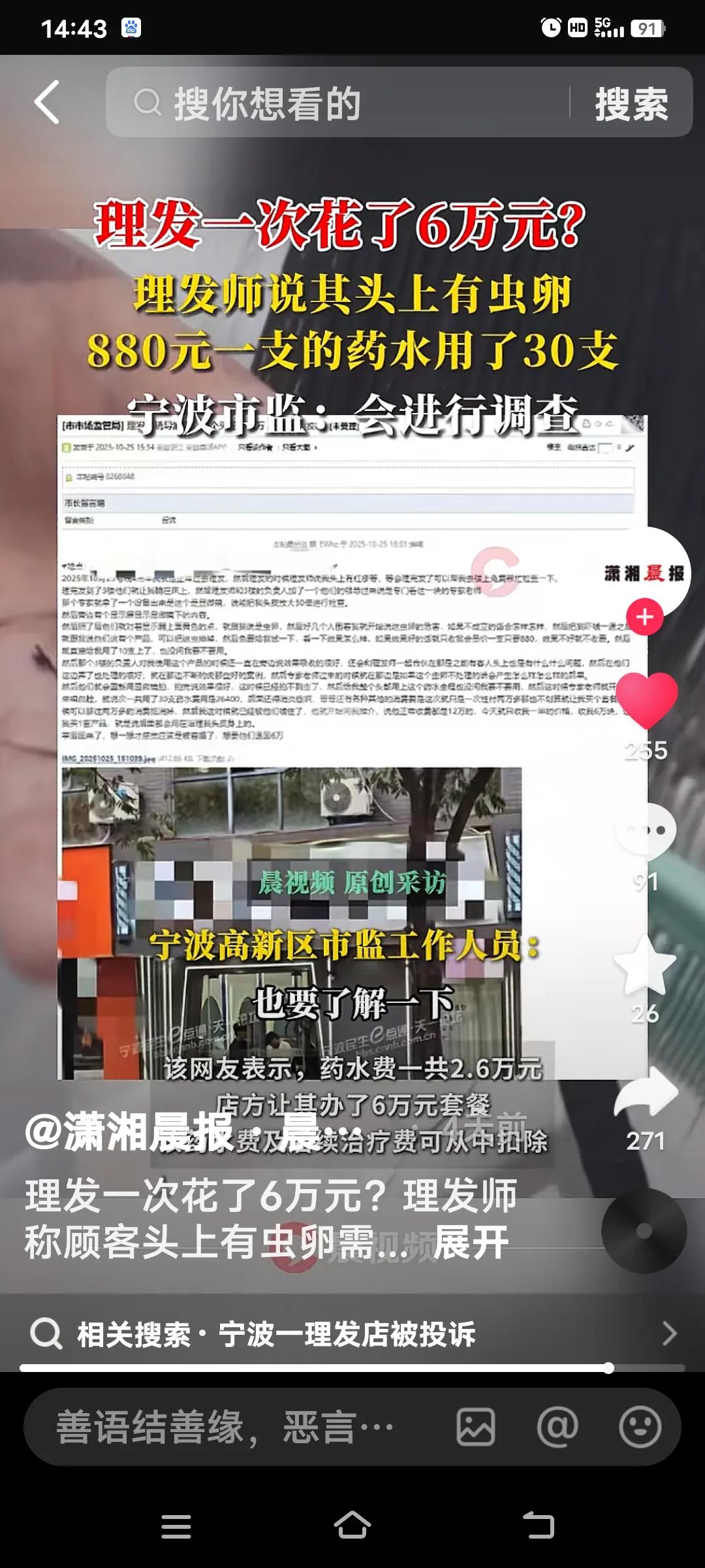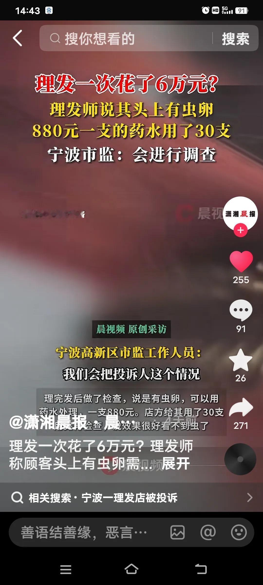 近日,宁波一家理发店又要“火了。”10月24日下午,一位网友去理发,竟花了6万元!这理发店可真是“狮子大开口”。 这位网友去理发时,其间理发师称头上有红疹,可免费检查。理完发后,店员“查出”其头皮有虫卵,便让他使用30支单价880元的“除虫药水”,药水费共计2.6万元。 之后,店方又劝他办理6万元的套餐…… 这套路也太明显了。目前,市场监管部门已介入调查此事。这家理发店若真靠这种手段赚钱,实在不地道。希望相关部门能尽快查明真相,给消费者一个公道。 说到底,有些人真是糊涂,也不想想头上能有什么虫,要花几万块钱来处理?都是事情过后才发觉被骗去投诉!要是没钱,想都不敢想会遇到这种事! 理发店遭天价 宁波美发事件