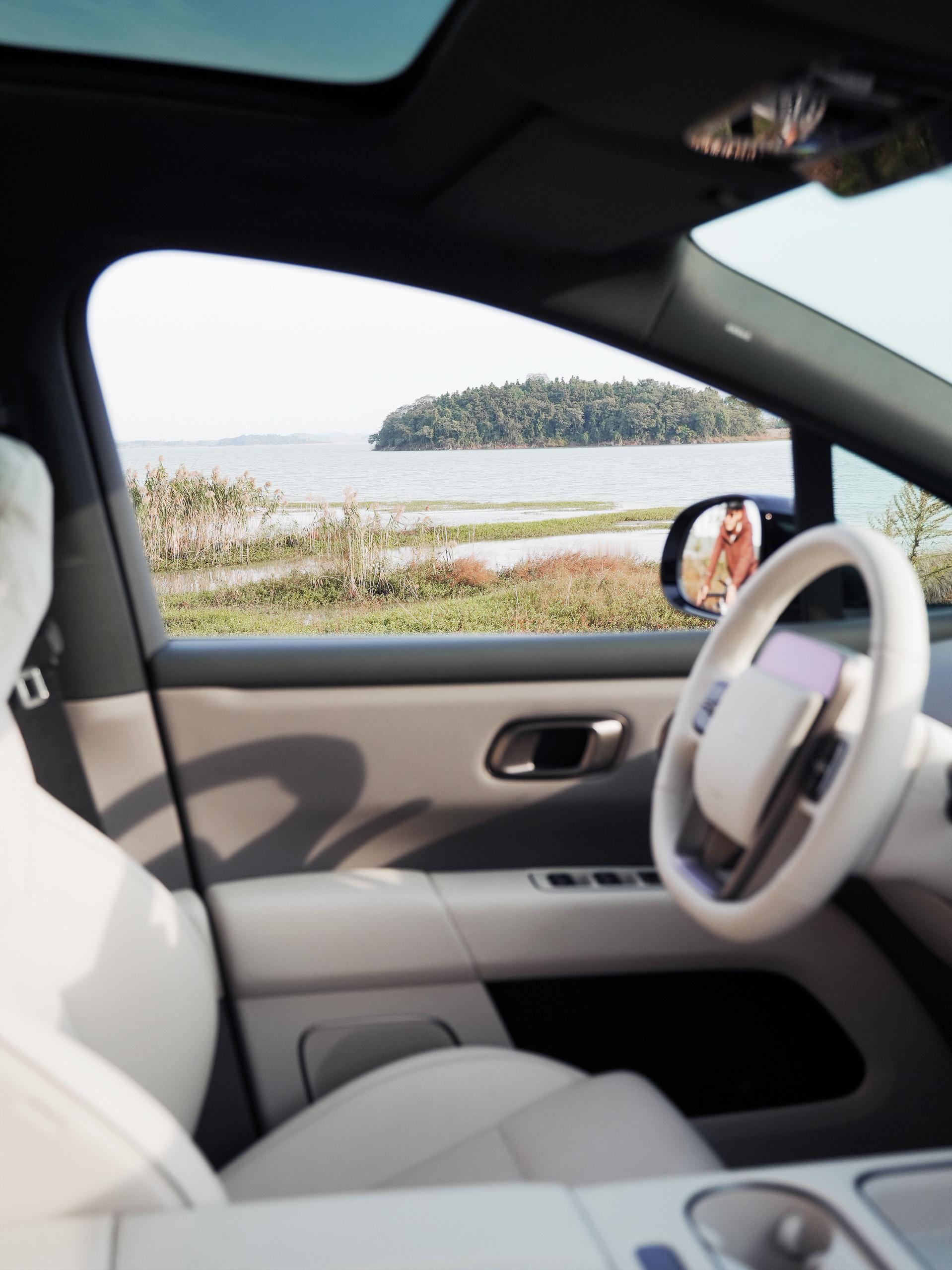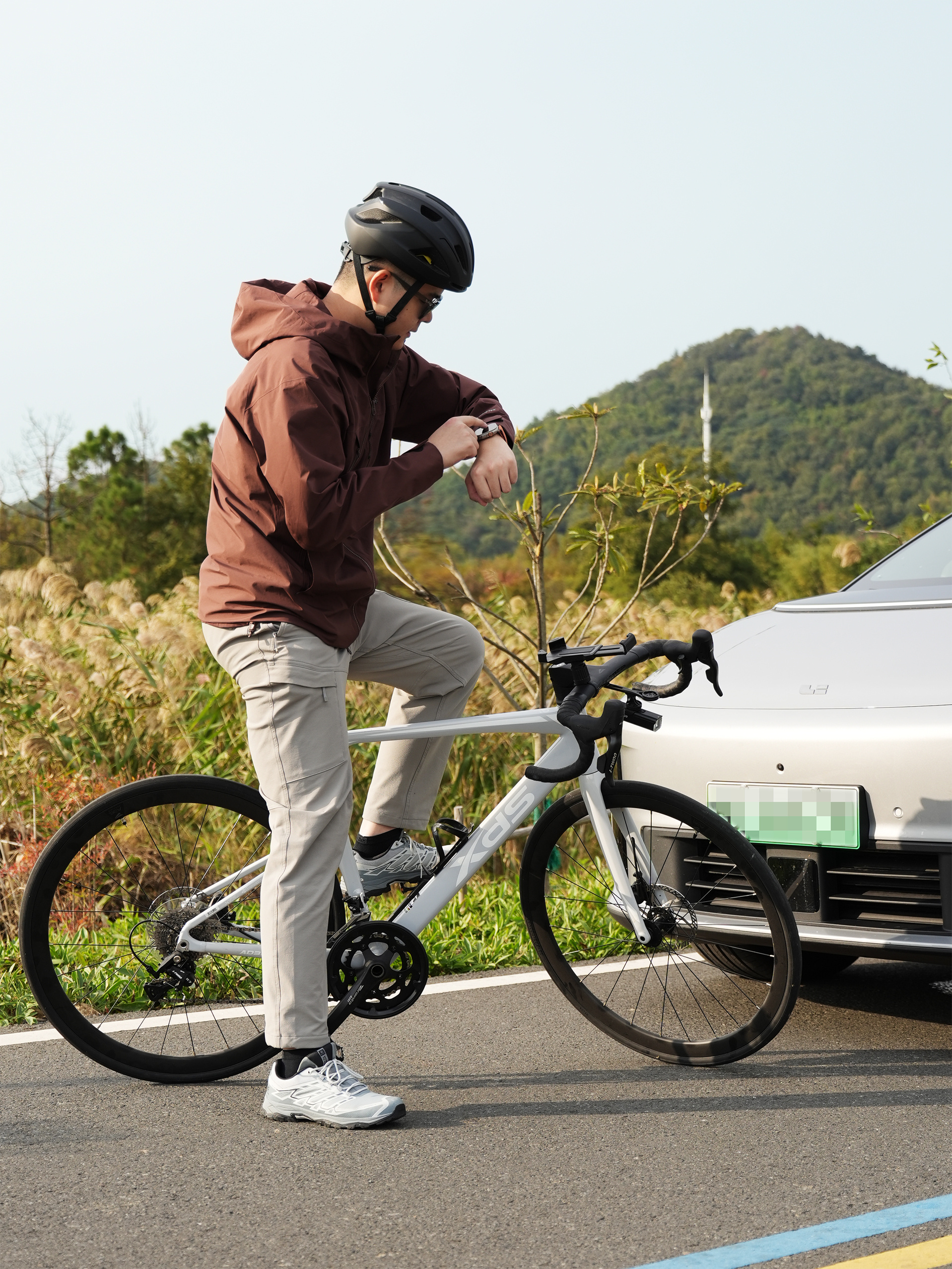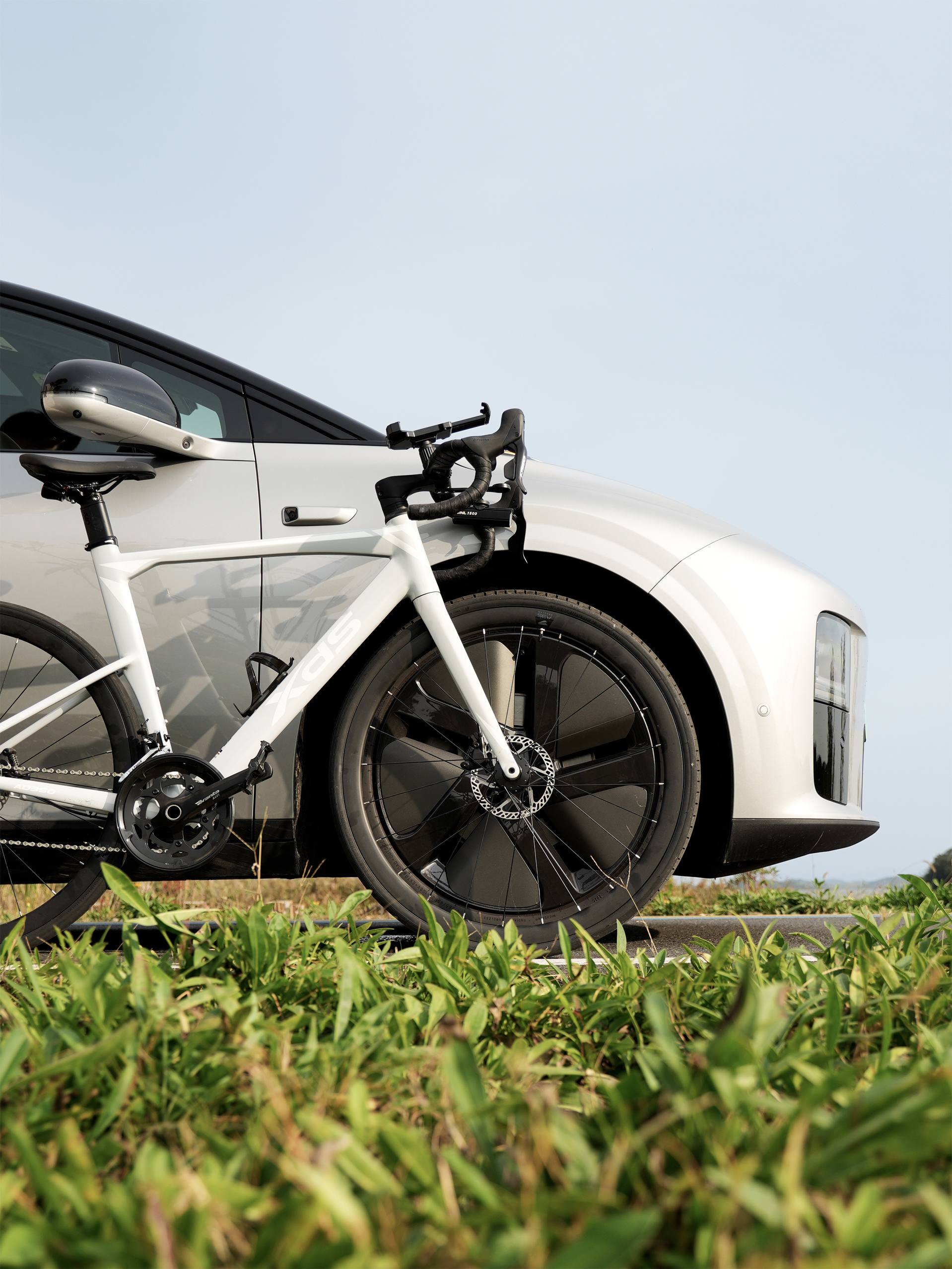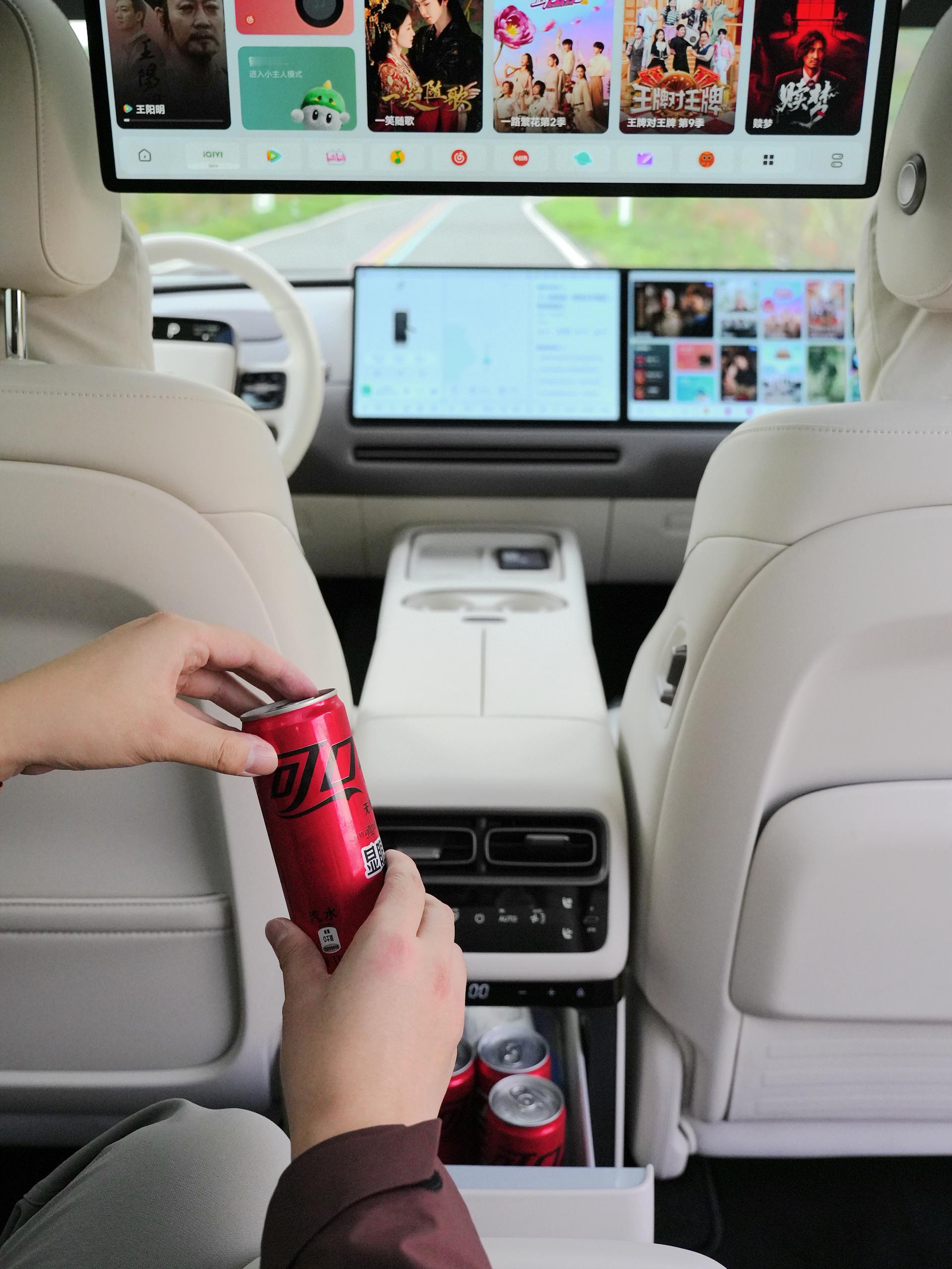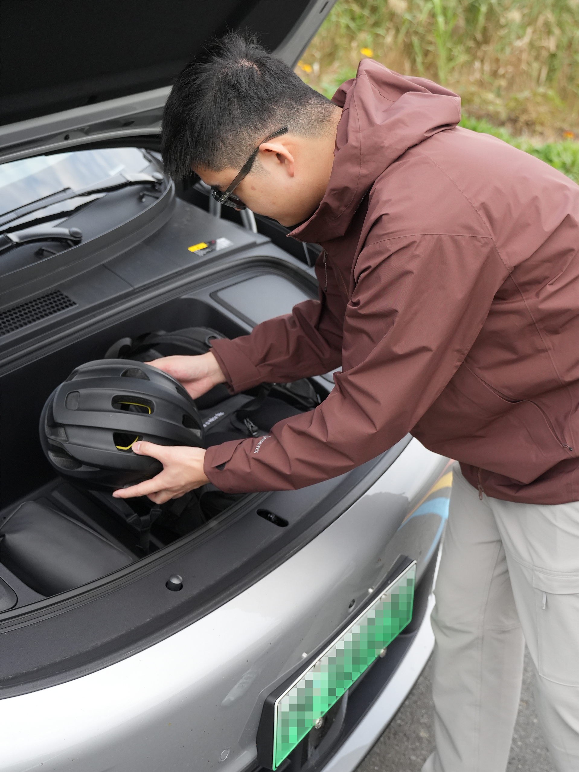 储物空间更是没话说,除了能装下自行车的后备厢,前备箱还能放下骑行头盔、手套和骑行背包,而且得益于它独特的前脸造型,我拿取东西时也很方便,腿碰不到车头,不用担心会蹭脏裤子。在后备厢取车时我也可以调节空悬高度,整个流程都更轻松。而且车内的车载冰箱以及后排娱乐屏就是骑行途中的“续命神器”。骑累了回到车上,开启座椅通风和按摩功能,喝着冷饮看着电视,整个座舱就像移动的休息站。