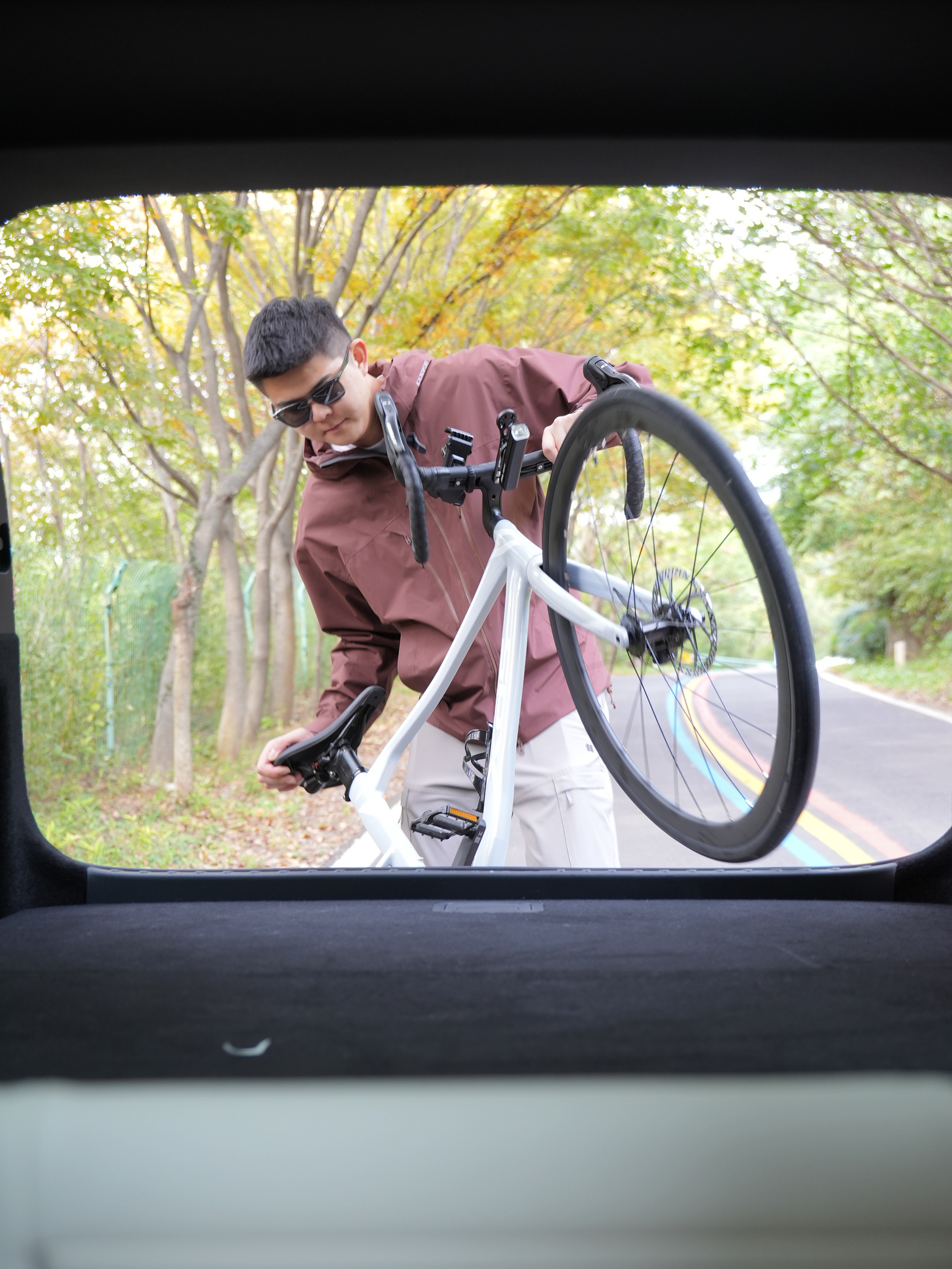 先说说外观,这辆“外星银”的配色在阳光下超有质感,流畅的车身线条搭配贯穿式尾灯,停在溧阳1号公路旁就是一道风景线,尤其是它的车尾设计真的很喜欢,后备厢的空间也让人惊喜,后排座椅放倒后,我的公路车可以直接稳稳放进车内,不用额外装车顶架,既省心又保护车辆。