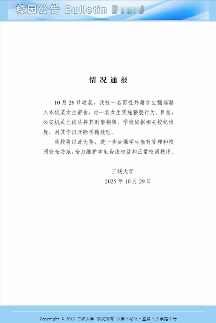 不知道是不是阿三哥? 10月26日凌晨,湖北宜昌三峡大学一名黑色留学生,从一楼铁窗爬到二楼,进入女生宿舍实施猥亵行为。女生惊醒跑出宿舍呼救,宿管阿姨报警。涉事留学生当天就被控制。公安机关将其拘留,学校开除其学籍。 学校的情况通报并没有说该学生是哪国人。也许不方便透露? 他为什么从一楼窗户爬到二楼?他也知道此举上不得台面,是不好的事情,只能偷摸行事。女生很勇敢,没让他得逞。 任何一个外籍人员在中国的领土上违反了中华人民共和国的法律,就必须依法严惩不贷,判刑入狱,出狱后驱逐出境,绝不允许这些不法之徒在校园内做违法勾当。