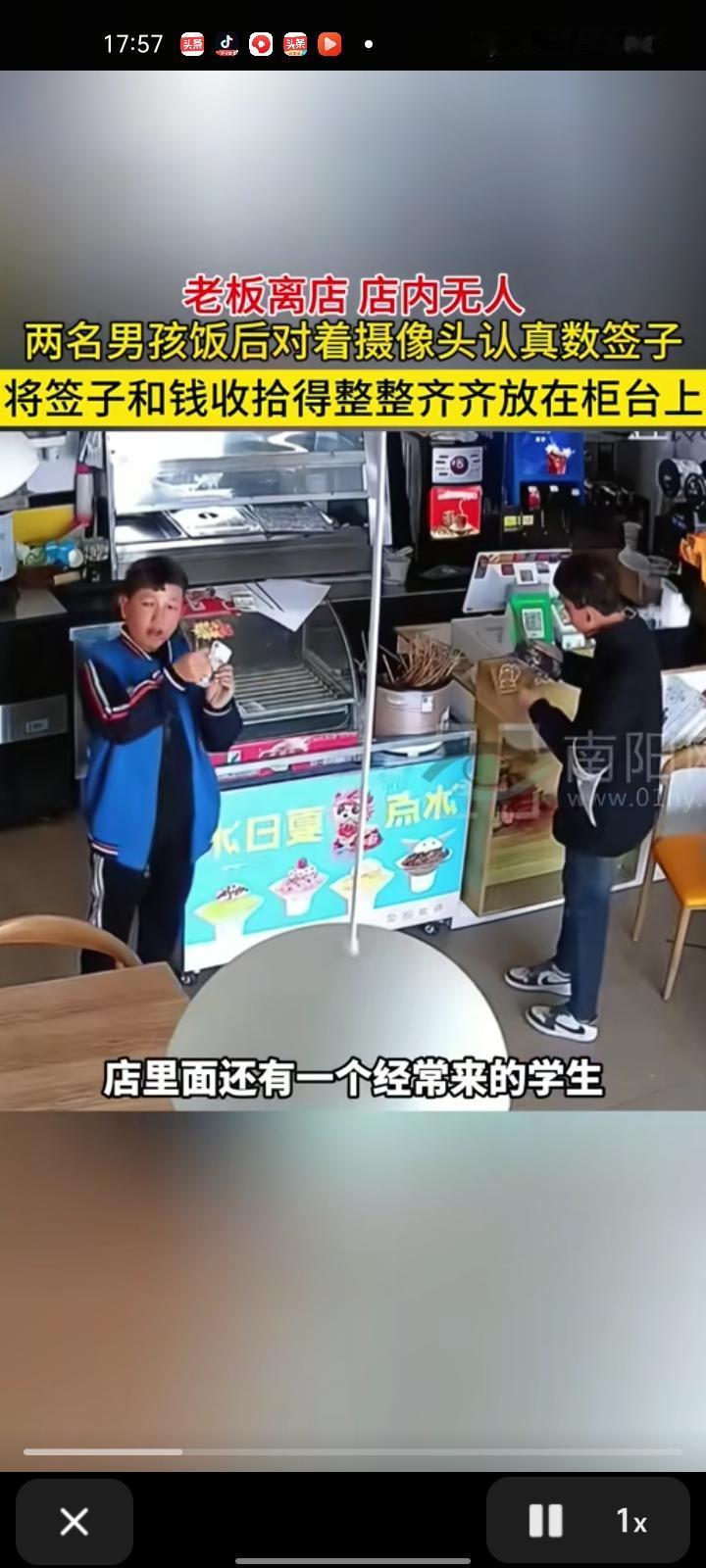 10月24日,巴州焉耆县。老板娘忙完高峰期,有急事离店时忘了锁门。两男孩来到店里吃完麻辣烫后,对着监控数签子,将签子和钱收拾整齐放柜台上。他们既可爱有讲诚信,是中国少年最好的样子。