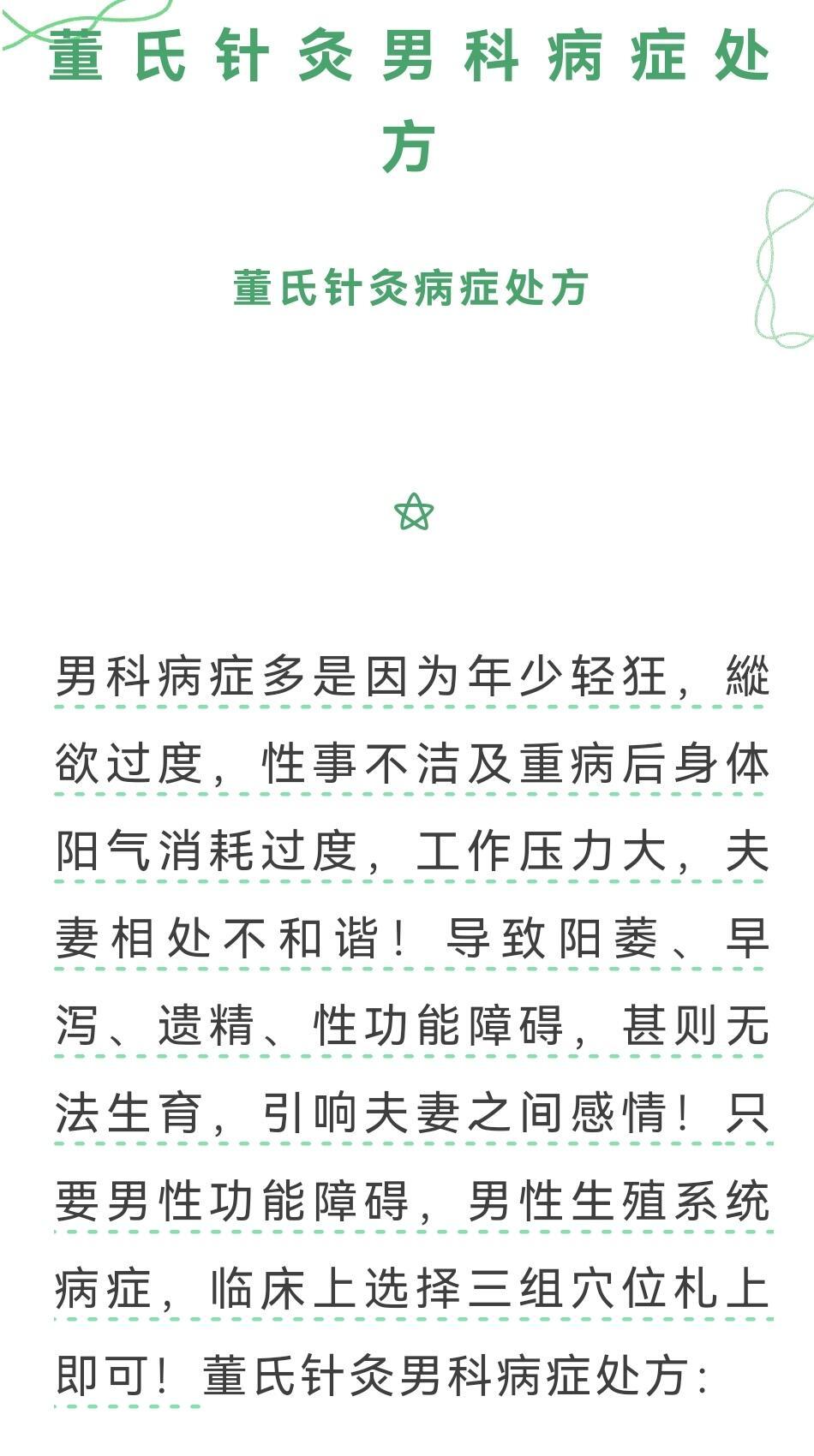 男科:男科病症多是因为年少轻狂,縱欲过度,性事不洁及重病后身体阻气消耗过度,工作压力大,夫妻相处不和谐!导致阳菱、早泻、遗精、性功能障碍,甚则无法生育,引响夫妻之间感情!只要男性功能障碍,男性生殖系统病症,临床上选择三组穴位札上即可!健康养生中医养生 ​​​