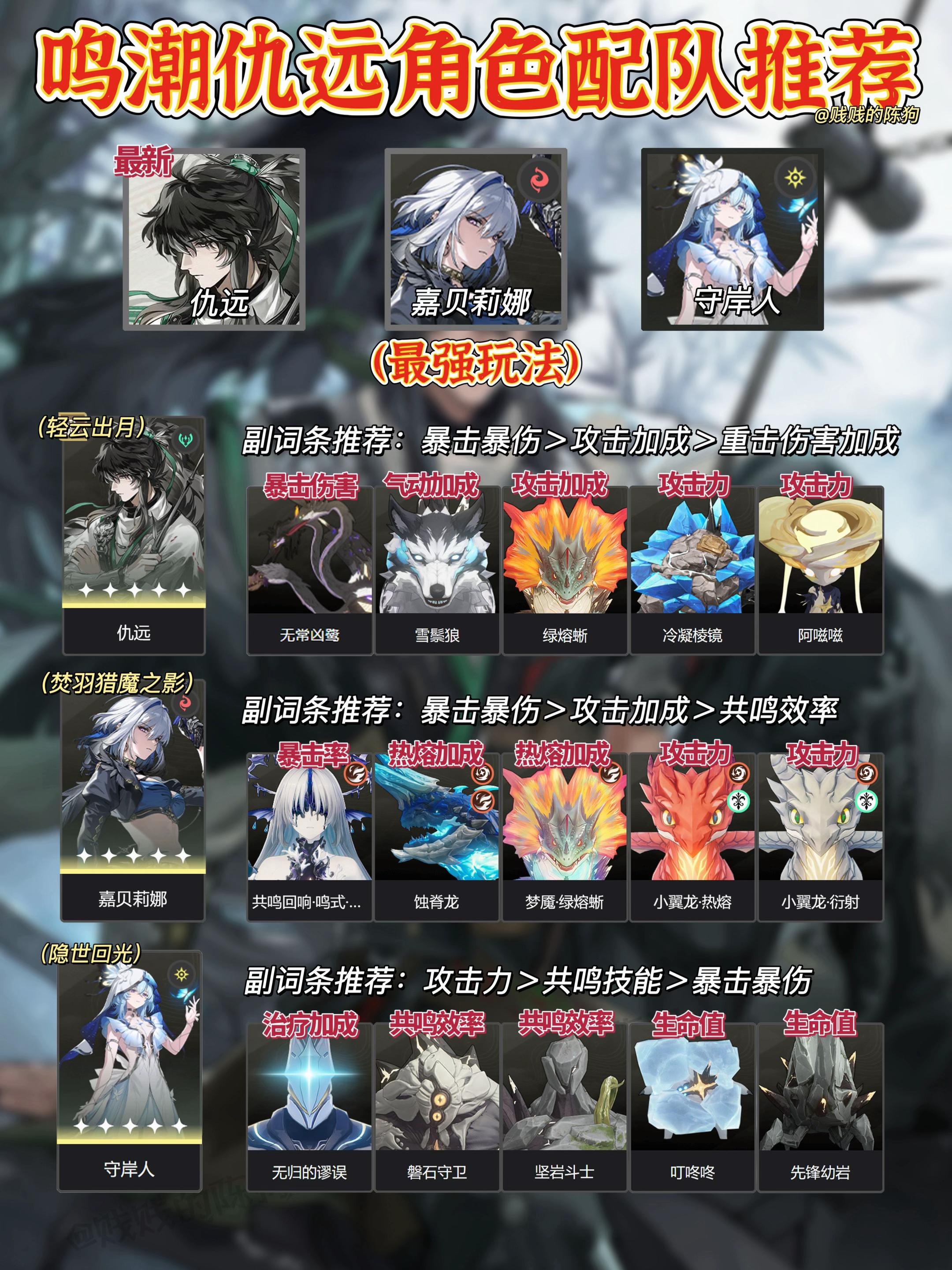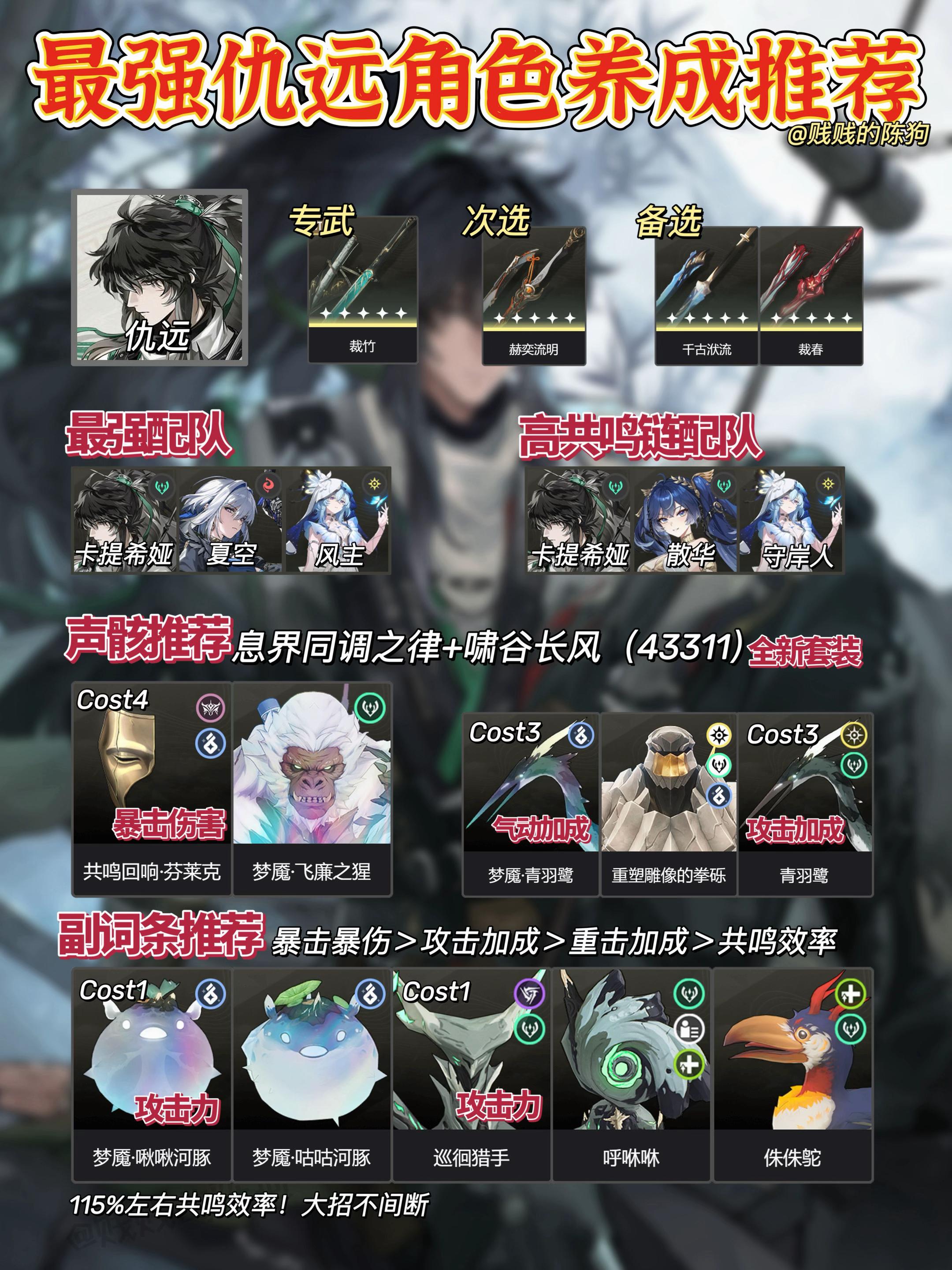 鸣潮|版本最强仇远角色养成攻略‼️轮椅流。鸣潮鸣潮仇远鸣潮暗潮将映的黎明 鸣潮配队 2.7版本最新轮椅流辅助~妥妥的风动最帅角色! 新手快码住这份仇远的攻略~拿捏新版本 ▫️声骸推荐 首选新套装:息界同调之律+啸谷长风(43311) Cost4搭配2个Cost3和2个Cost1组合 副词条推荐:暴击暴伤>攻击加成>重击加成>共鸣效率 👉其次推荐5轻云出月套装!和新套装对比相差不大 👉有专武情况下Cost3可以1气动加成+1攻击加成