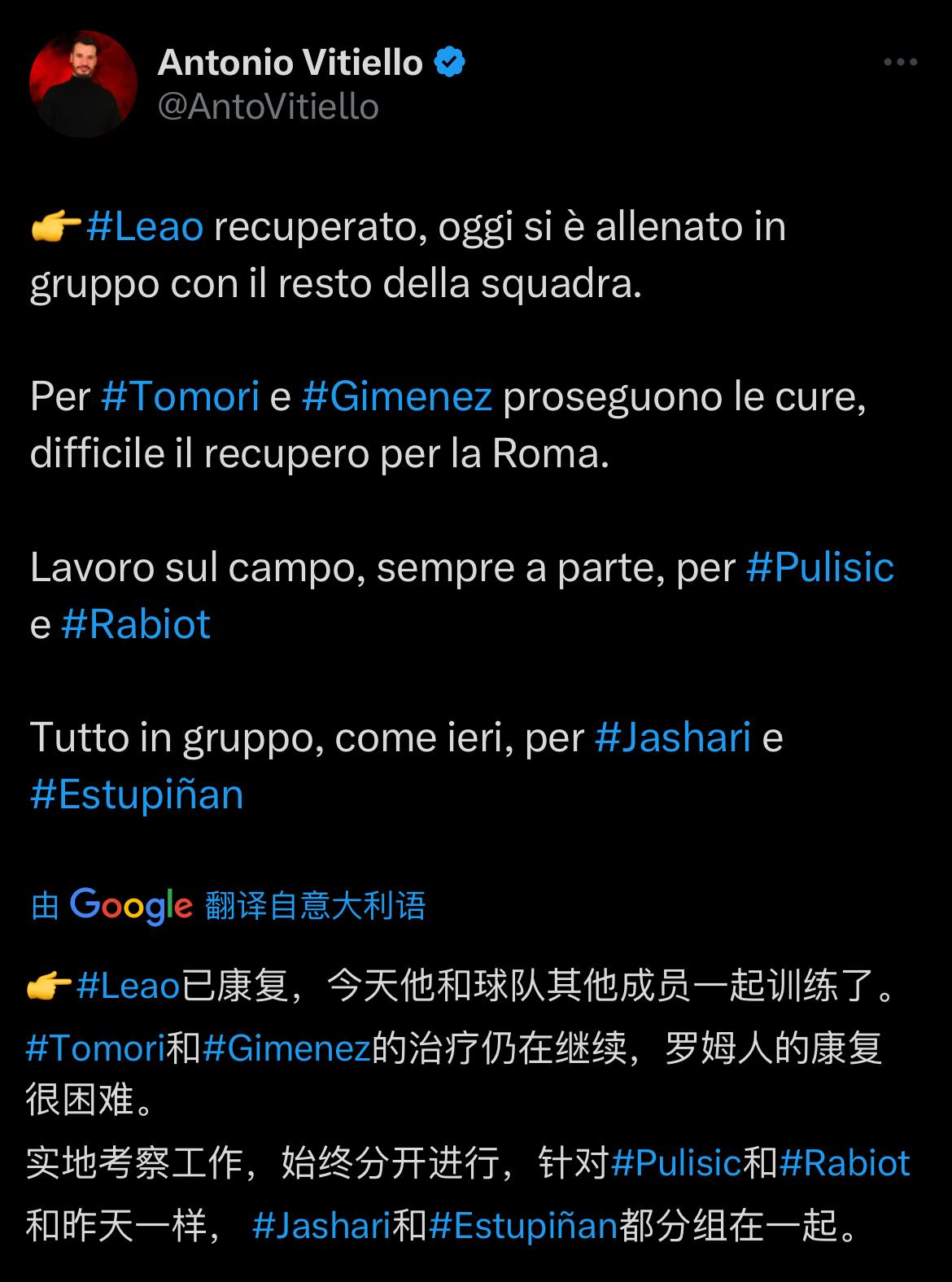罗马已在望,米兰队内的伤员们状况如何呢?来看看米兰跟队记者维蒂耶洛的报道! 好消息!莱奥今天恢复了和全队的合练,之前一直有消息说他髋部不适,有可能无法随队踢罗马,但今天他就恢复训练了!希望他身体状况良好,且有良好的发挥! 坏消息!托莫里和大西门今天仍在进行个人训练。大西门脚踝有问题,有时候疼,有时候不疼,就很玄学!托莫里的问题更加严重,他的膝盖和大腿在上一场和亚特兰大的比赛中受到了撞击,据说大腿还有淤青和血肿。从目前的情况看,这两位很难赶得上周末和罗马的比赛了! 不好不坏的消息,普利希奇和拉比奥特还是无法出战,也是出于谨慎的考虑。两人不会入选大名单,不会坐上替补席。但下一场对阵帕尔马队的比赛,两人有可能复出! 最后,和昨天一样,贾沙里和埃斯图皮尼安今天也随全队一起训练了,代表两人的伤情恢复顺利。埃斯图皮尼安有机会在对阵罗马队时首发出场,而刚刚从骨折中恢复的贾沙里,也因为他所踢的位置,应该还需要保持耐心,慢慢来! 黎明前最后的黑暗了!对阵罗马,米兰要加油鸭…….