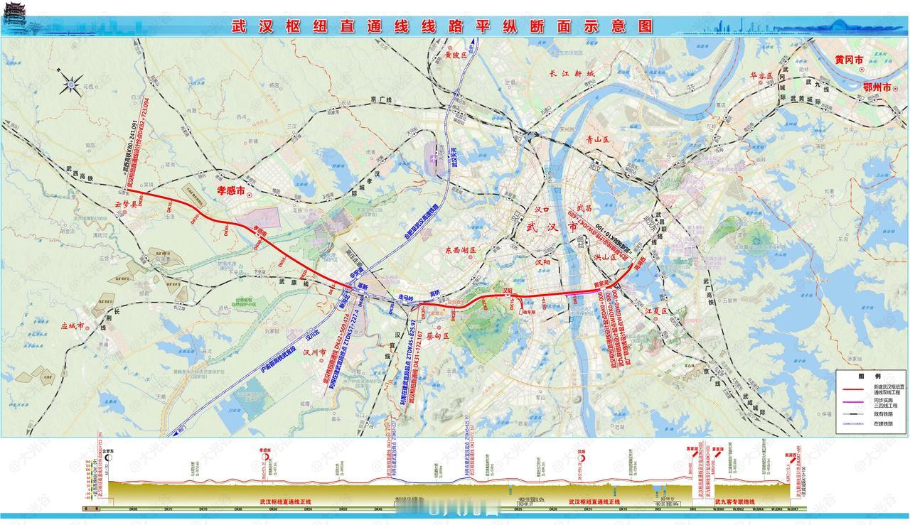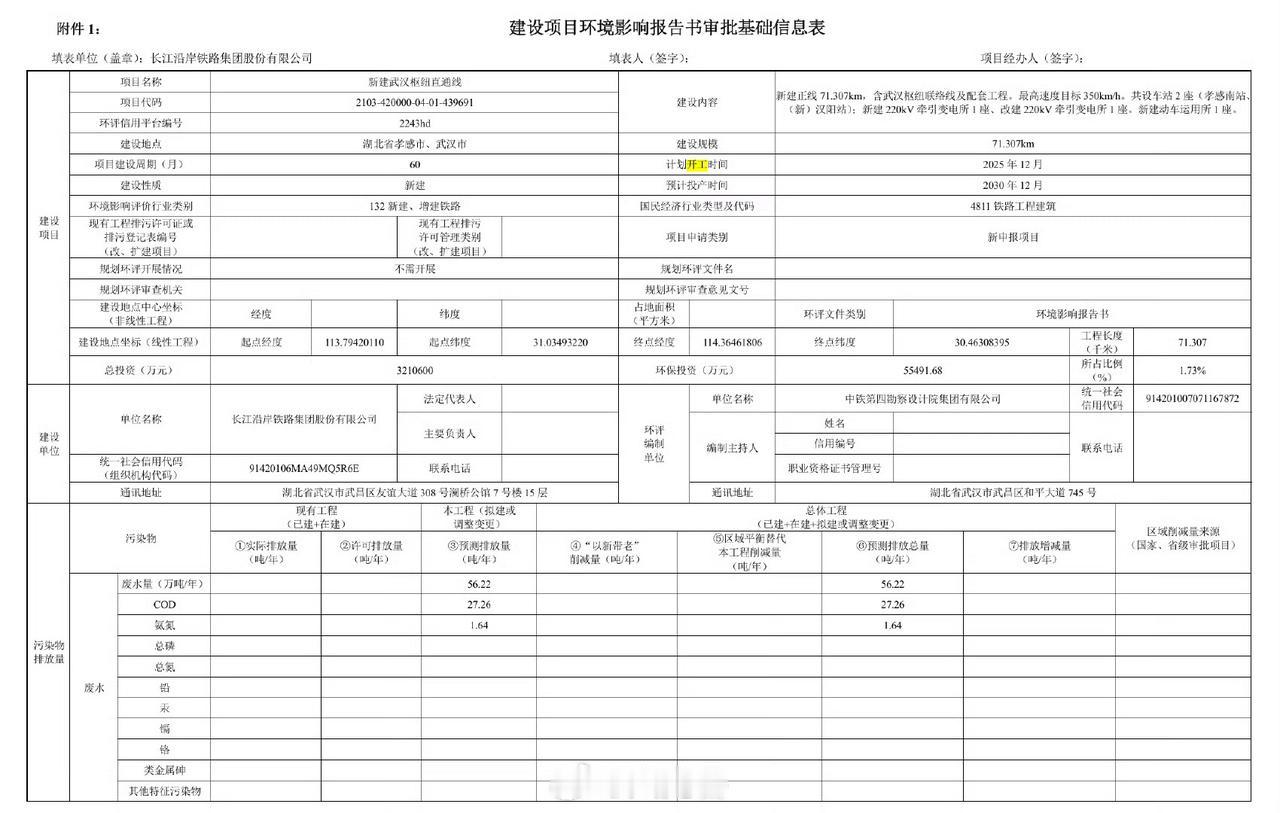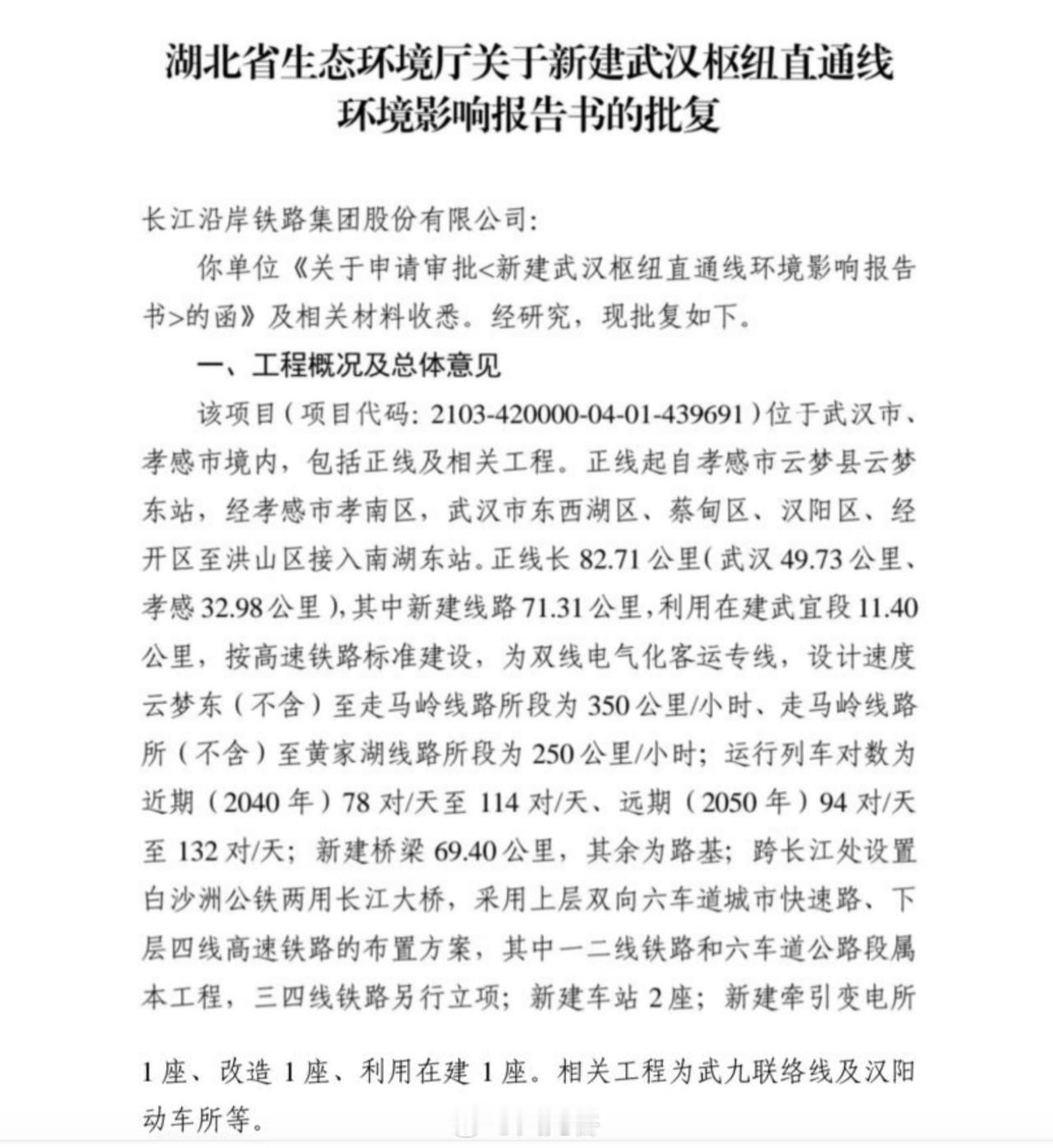 武汉枢纽直通线环境影响报告书批复! 10月30日,湖北省生态环境厅关于新建武汉枢纽直通线环境影响报告书的批复发布。 据悉,项目位于武汉市、孝感市境内,包括正线及相关工程。正线起自孝感市云梦县云梦东站,经孝感市孝南区,武汉市东西湖区、蔡甸区、汉阳区、经开区至洪山区接入南湖东站。 正线长82.71公里(武汉49.73公里、孝感32.98公里),其中新建线路71.31公里,利用在建武宜段11.40公里,按高速铁路标准建设,为双线电气化客运专线,设计速度云梦东(不含)至走马岭线路所段为350公里/小时、走马岭线路所(不含)至黄家湖线路所段为250公里/小时;运行列车对数为近期(2040年)78对/天至114对/天、远期(2050年)94对/天至132对/天;新建桥梁69.40公里,其余为路基;跨长江处设置白沙洲公铁两用长江大桥,采用上层双向六车道城市快速路、下层四线高速铁路的布置方案,其中一二线铁路和六车道公路段属本工程,三四线铁路另行立项;新建车站2座;新建牵引变电所1座、改造1座、利用在建1座。相关工程为武九联络线及汉阳动车所等。 根据环评书报告显示,项目总投资329.23亿元,环保措施投资占比1.17%,计划总工期5年,计划2025年12月开工,预计2030年建成。白沙洲公铁两用长江大桥采用“上公下铁”设计,上层为双向6车道城市快速路,下层为4线高铁轨道,公铁合建段总长3812米。配套建设声屏障等环保措施,总投资约2.45亿元,以减少噪声对周边居民影响。项目建成后将解决武汉高铁网络换向难题,成为沿江高铁通道和武西高铁的关键工程,助力武汉打造“超米字型”高铁枢纽。
