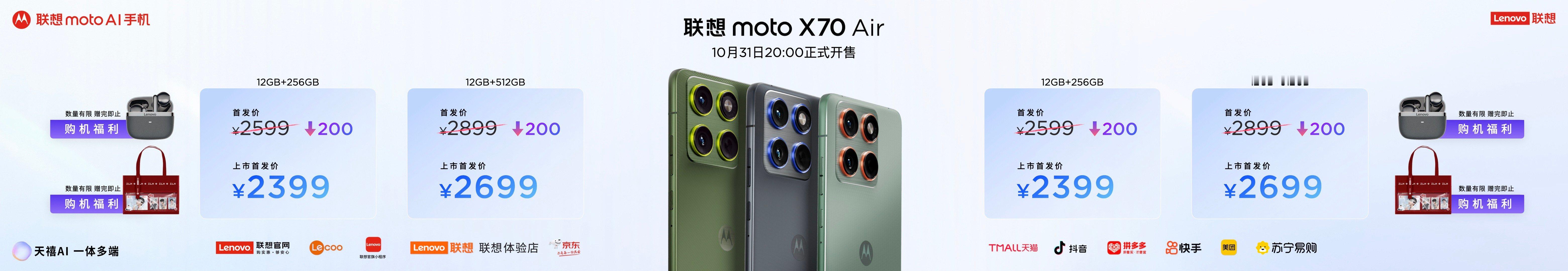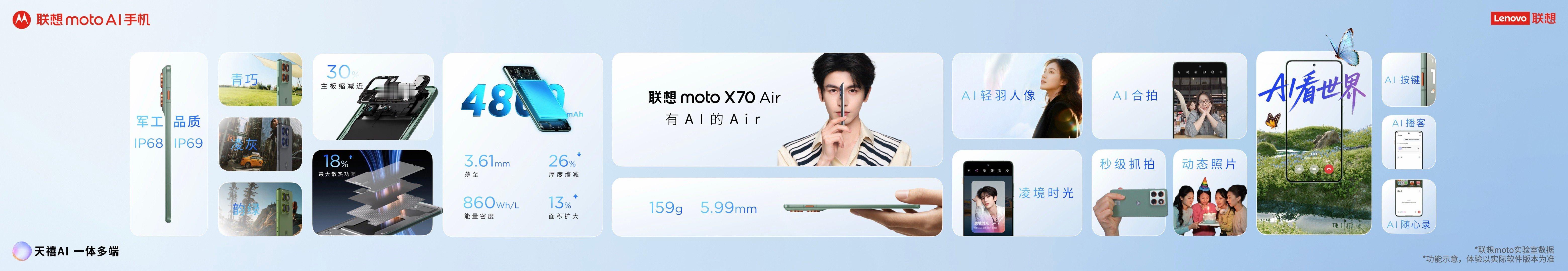 联想moto新品发布会重磅来袭!核心焦点moto X70 Air AI手机惊艳登场,159g超轻机身仅约3颗草莓重量,5.99mm薄如护照,堪称市场最轻卡片手机,握持无负担裸机使用更放心。