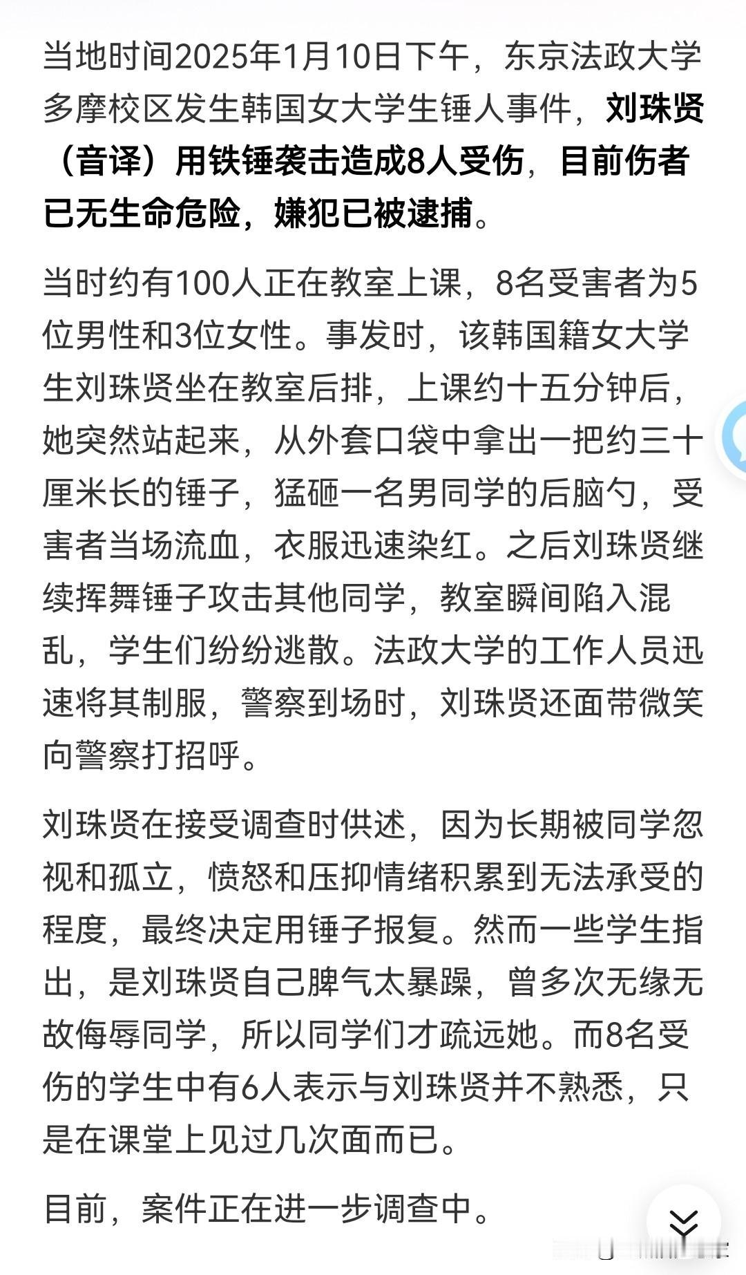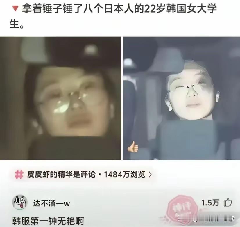 “韩国女大学生持锤对抗八名日本人:家国仇恨里的当代‘花木兰’ 历史是最好的教科书,它镌刻着民族的伤痛与不屈。22岁的韩国女大学生,以近乎‘花木兰’式的刚烈,挥锤直面八名日本人——这不是莽撞的冲突,而是深埋于民族记忆里的家国仇恨在当代的回响。 日韩之间的历史纠葛,如未愈合的旧伤,时刻提醒着每个有民族情怀的人。这位女大学生的举动,或许在法理上需要审视,却在情感维度戳中了太多人对历史不公的共鸣。她不是孤勇者,而是被家国仇恨的底色所驱动,成为了一段复杂历史的当代注脚。 就像网友调侃的‘韩服第一钟无艳’,她的身影在争议中更显锋利——这背后是两个民族在历史长河里的拉扯,更是普通人在宏大历史命题前,以个体姿态发出的一声嘶吼。历史从不是冰冷的文字,它是鲜活的情绪,是代代相传的爱恨,在这一刻,借由一个22岁女孩的举动,再次沸腾。”
