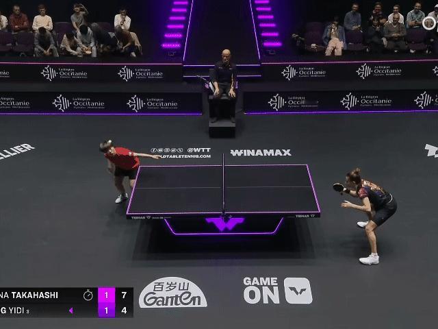 好!大迪追平了比分!比赛来到决胜局[奋斗]! 前三局王艺迪🇨🇳11-8,9-11,6-11,11-4追平高桥·布鲁娜🇧🇷! 现场吵的厉害,观众席上欧洲壮汉举着小喇叭不停地吹,高桥布鲁娜又一声接着一声地尖叫。 第三局大迪被裁判判了发球角度,罚了一分,这可恶的裁判, 这是WTT冠军赛蒙彼利埃站女单1/8决赛! 现场观众真是吵的很,继续吵吧,今晚大布也熄火。 大迪决胜局继续加油[奋斗]!