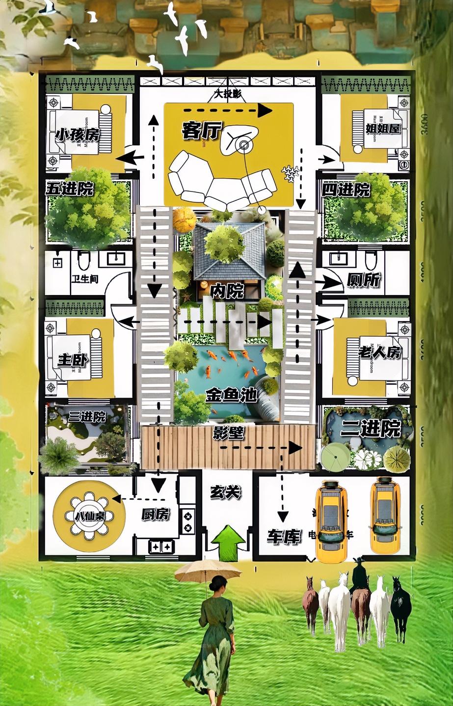 咱就说,四合院这个赛道,最无敌的是五进院,内院最熟悉的布局,熟悉的洄廊,熟悉的金鱼池,熟悉的三代同堂! 谁要是喜欢221㎡,适应左车庫右餐厅,最拿得出手,哪个另类的餐厨一体化,穿厨越厅! 对老乡们来说,正常的生活方式,对城里头人,动线倒反天罡! 也许年轻人不喜欢一个类型。 你研究的精透,这布局讲通透,佩服它的高调,寻找对称美! 当然,一进院还是文绉绉,先影壁,中鱼池,后花亭,30㎡内花园,几乎大合院的底蕴,照顾全部12个空间,把借绿入屋内,发现挥到极致,一个不落儿,连车库开一扇后门! 纯大白话,意境最全面的内院! 也是五进院里的王者,放在其他合院里,可能不好使了。 剩余的四进院,面积相当,都是9.3㎡,不相同的位置,不相同的功,种地,种草,养鱼,引天井,能演绎出,几部农村生活戏! 其实给四个卧室,创造出不同的绿意,而且都专业量身打造,一对一出镜,五星级别的窗景! 这种天然的吸睛点,都是后天包装出来的,而是五进院独享的,面积对我应大平层,格局看齐大别墅!