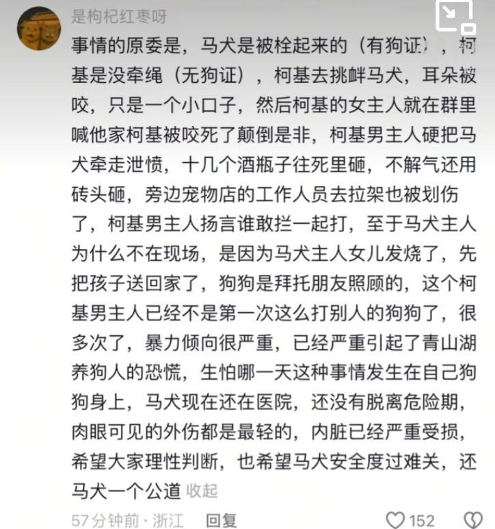 10月29日,浙江杭州。网友发布视频,一男子用酒瓶和砖头疯狂打砸一只狗,狗子惨叫声不绝于耳…… 据知情者透露,事件是由两条狗引起的,男子疑似柯基的主人,柯基去挑衅一只栓着绳的马犬,结果耳朵被咬了。男子气不过,就拿马犬出气了。有人尝试上去劝阻过他,被他一句“谁敢拦一起打”,也不敢上去劝了…… 网上还透露一点信息,被打的马犬是有证的当时栓着绳,男子家的柯基是没证的,当时没有栓绳。 以上都是网上流出的信息,大家自行判断真伪。 目前,该事件当地警方已经介入,看看后续会给出怎么样一个处理结果。