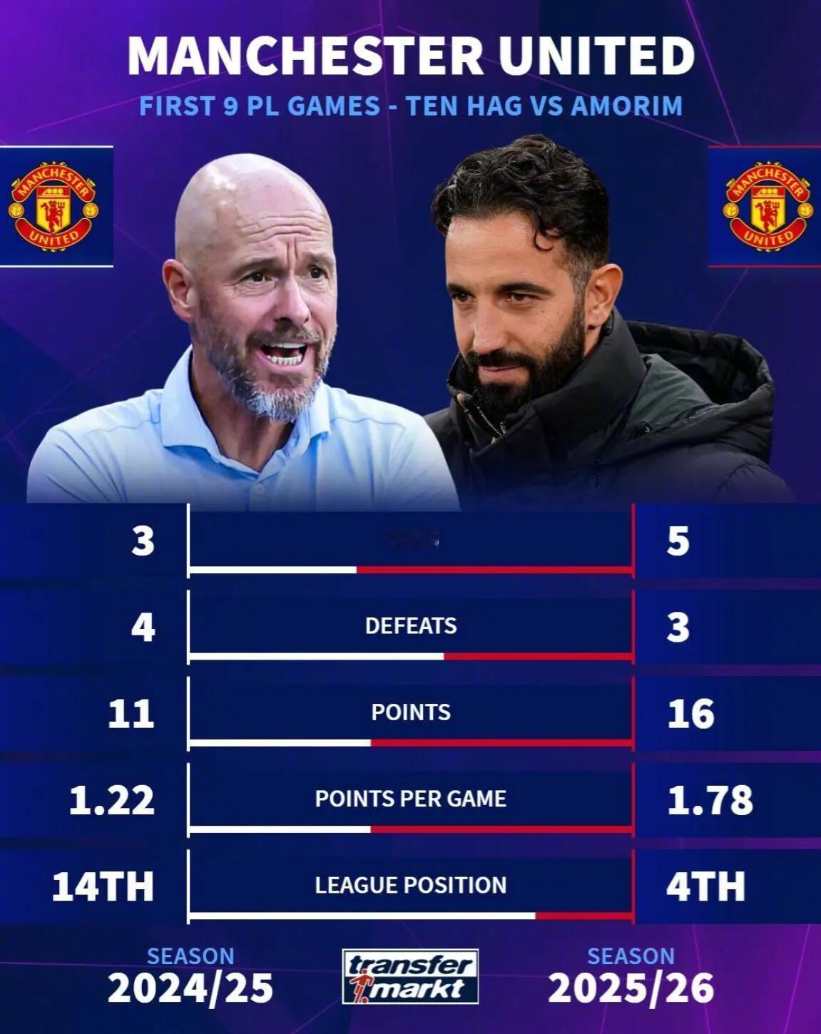 英超分水岭! 这个周末结束后,英超的争冠形势很可能就会基本定型,只要阿森纳赢球,利物浦、曼城依然低迷,枪手的冠军差不多就稳了!另外曼联能否冲击欧冠资格,是否真正的找到正确的道路,这一轮也很关键。 ★阿莫林执教曼联本赛季和上赛季的英超数据对比! ★自弗格森2012年离任后,曼联历任主帅达成3+场连胜的次数统计! ★曼联自2024年8月以来,首次取得英超3连胜,也是自去年2月以来,首次在同一赛季取得英超3连胜。 ★阿莫林和前任滕哈格的赛季前9轮数据对比! ★曼联在最近6场英超联赛里赢下了其中4场,期间只有阿森纳的5场胜场比他们多。 ★塞斯科最近3场代表曼联首发的比赛,均有参与进球。 ★利物浦各赛事近7场1胜6负,联赛杯0-3不敌水晶宫,虽然强队都不约而同选择雪藏主力,但人家的小将真的得到了锻炼,而利物浦的小将们则是被摧毁了自信。