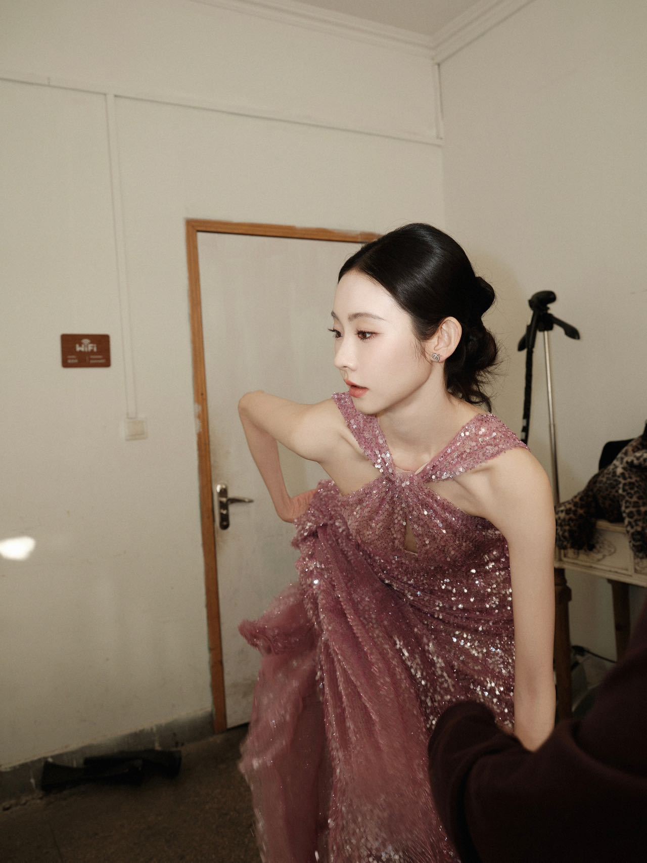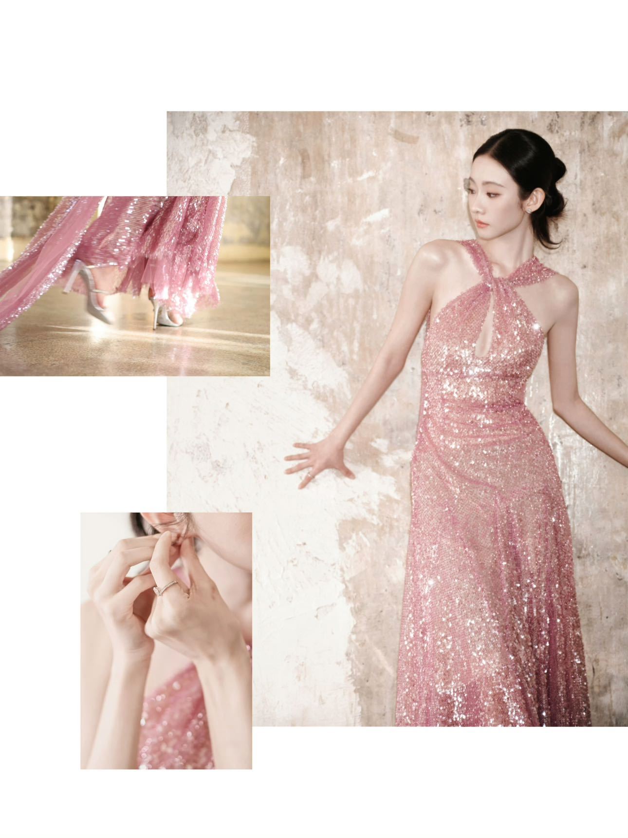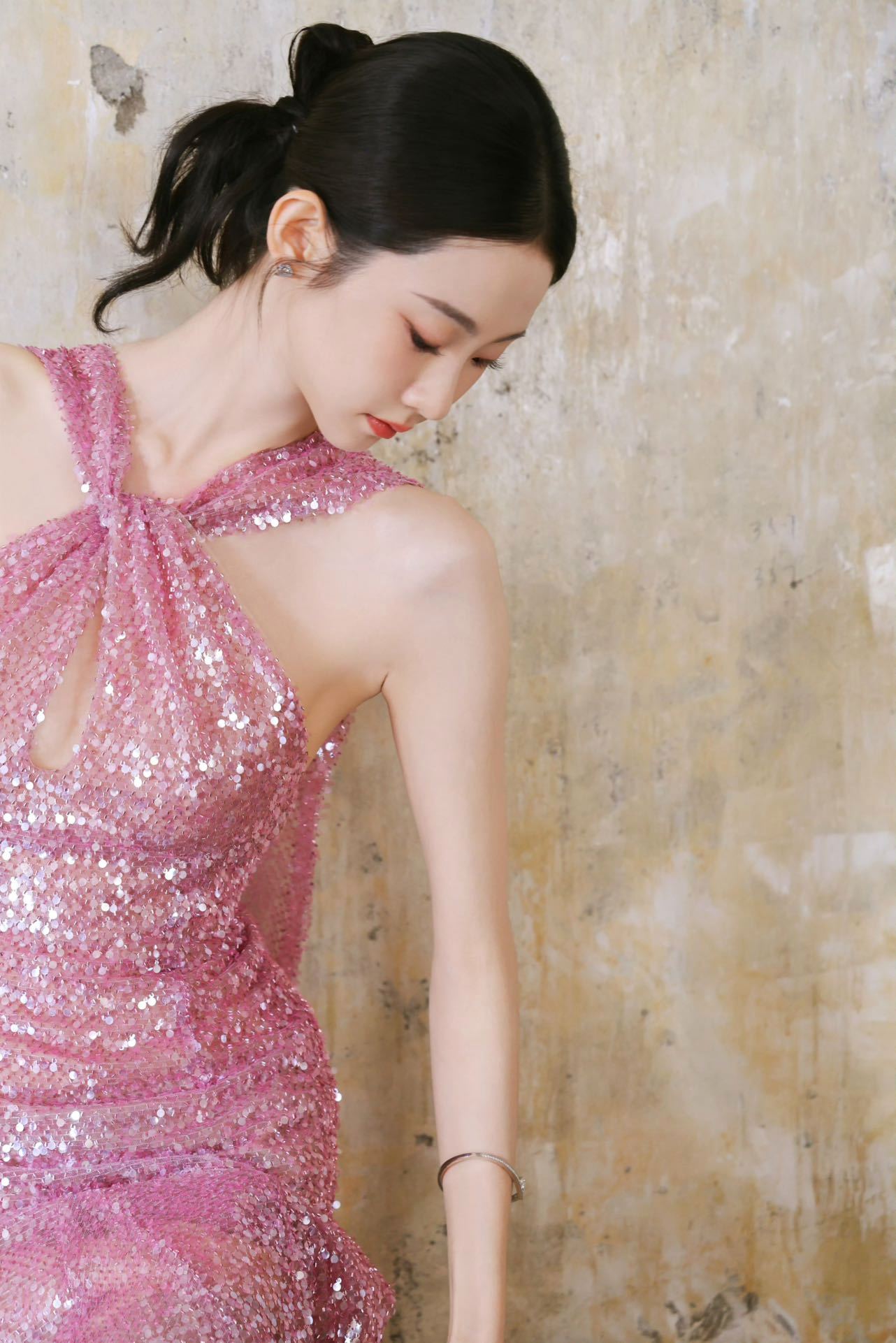 连光都偏爱张艺凡 粉色亮片裙的光泽感与张艺凡的清冷感绝配!交叉颈设计放大优势,天鹅颈又直又美,光落在她身上都舍不得走谁懂✨