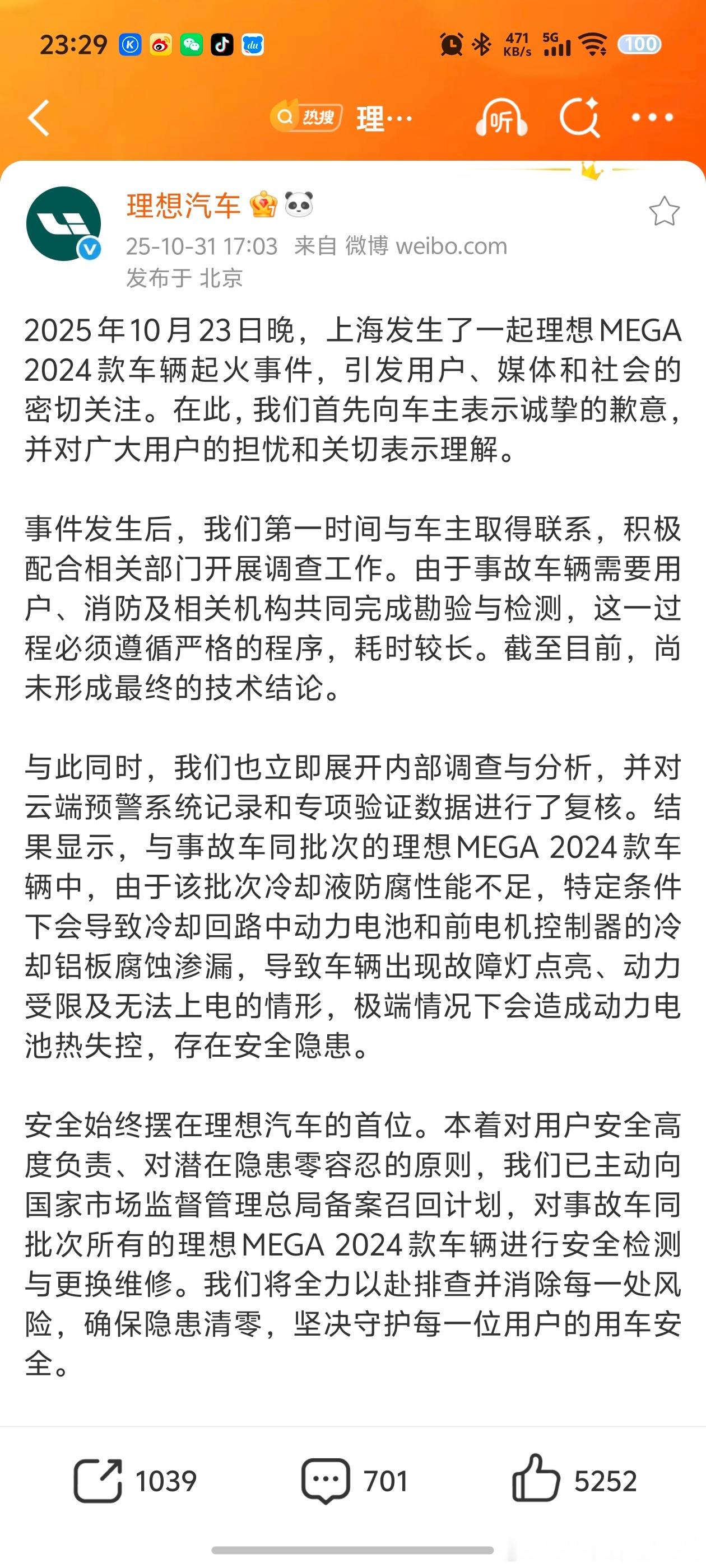 忙了一天才看到理想汽车召回了理想MEGA车型,这次起火事件影响还是蛮大的,召回更换相关硬件。不得不说,这个处理方式没毛病,有问题及时去解决,去避免发生更大的问题。面对这些负面舆论,理想自己积极面对并且改进问题,这是一个优秀公关该有的样子。理想就车辆起火道歉