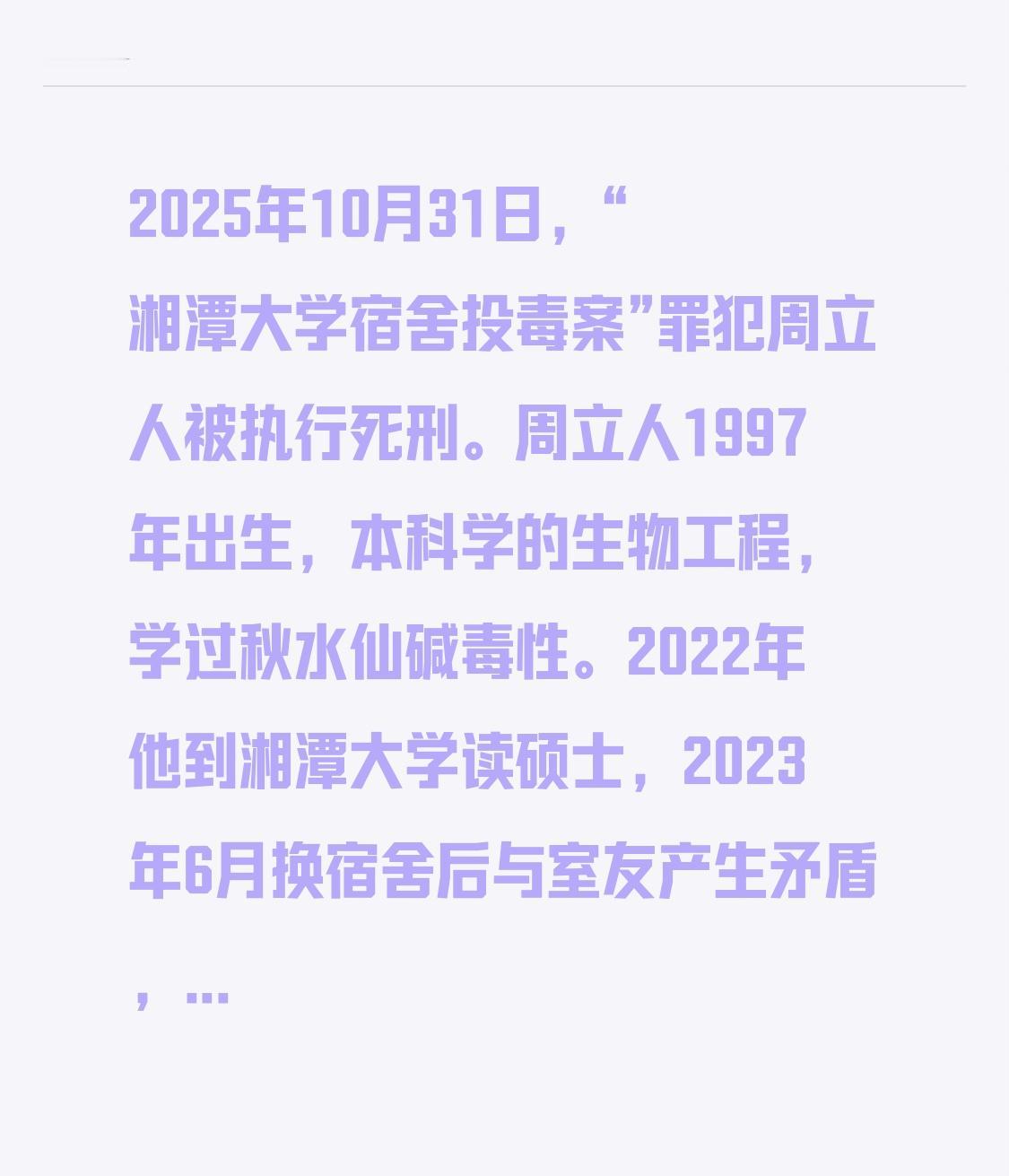2025年10月31日,“湘潭大学宿舍投毒案”罪犯周立人被执行死刑。周立人1997年出生,本科学的生物工程,学过秋水仙碱毒性。2022年他到湘潭大学读硕士,2023年6月换宿舍后与室友产生矛盾,甚至在日记写下要清除室友。2024年4月,他网购秋水仙碱,投放到室友共食的麦片里,导致张某某死亡。 这起悲剧令人痛心,本应是同窗共读的美好时光,却因琐事积怨酿成大祸。生命无价,冲动是魔鬼,希望这样的悲剧不再发生。