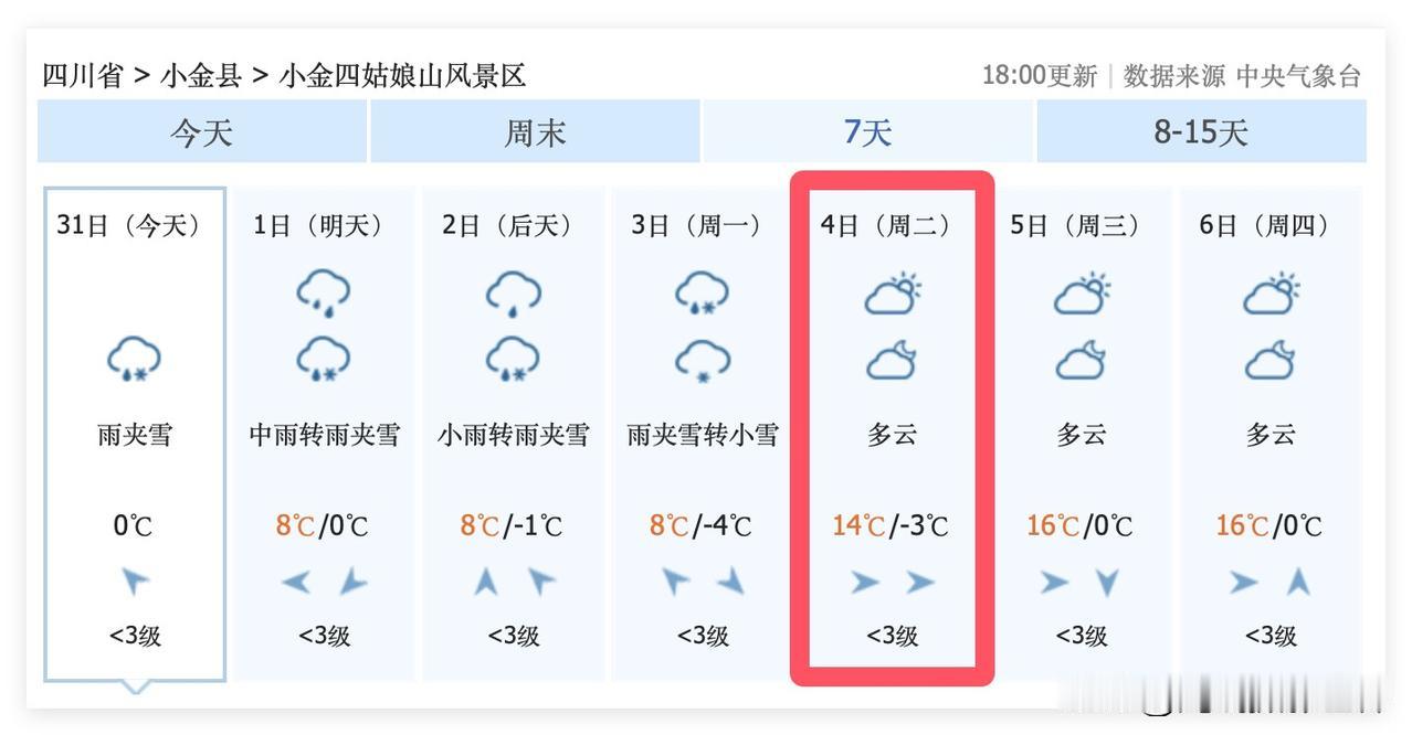 11月4日,川西的秋天,可能会是史诗级的封神级别的秋色+雪山!因为,11月1日凌晨,川西很多地方都在下大雪,折多山……11月1日到3日,川西很多地方都会飘雪,暴雪,大雪,中雪,小雪,雨夹雪……雨雪天气! 11月4日,雪后初晴……川西的秋色,红叶,彩林……可能会迎来最后的巅峰疯狂!错过,再等一年! 九寨沟,毕棚沟,四姑娘山,黑水奶子沟,新都桥,塔公,八美……理小路…… 2025年秋天的川西秋色,即将迎来大结局! 这次的大结局,也有可能会是2025年川西秋色的史诗级巅峰! 重庆人,渝A大军,准备好了吗?! 只是,苦了这周末去川西看秋色红叶的重庆人啊! 11月1日,星期六,重庆小雨,川西下雪! 11月2日,星期天,重庆小雨,川西下雪! 这周末,去川西的小伙伴们,看大雪漫天飞吧!