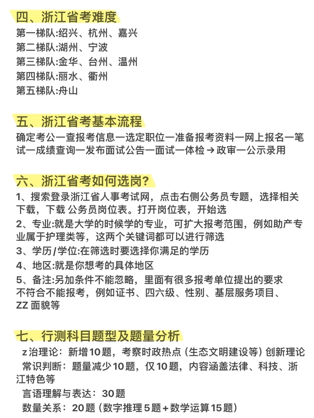 打算参加浙江省考省考,但是对考公一窍不通的宝子赶紧码住!一篇笔记搞懂浙江省考全流程! - ✅浙江省考全流程 [一R]浙江报考条件 [二R]时间节点 [三R]省考基本流程 [四R]浙江省考难度 [五R]浙江省考待遇 [六R]浙江省考笔试题型 [七R]浙江省考具体题型分析 [八R]浙江省考如何选岗 [九R]浙江省考备考