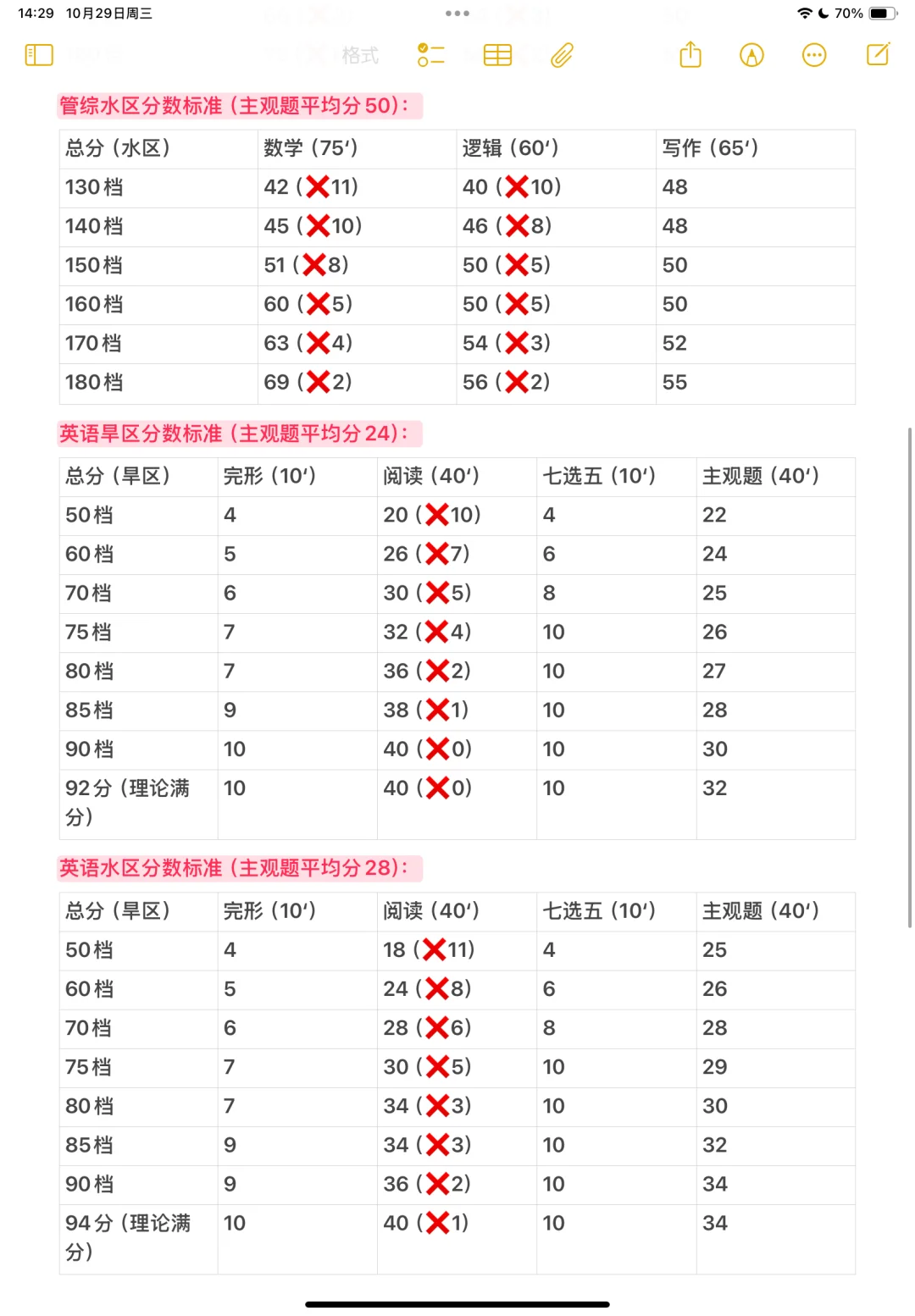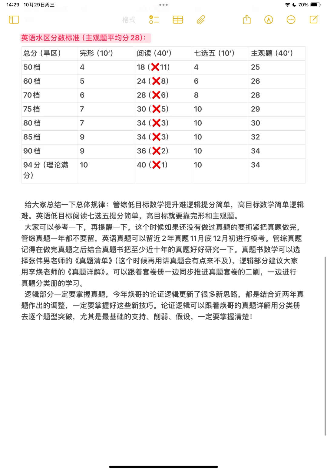 给大家总结一下总体规律:管综低目标数学提升难逻辑提分简单,高目标数学简单逻辑难。英语低目标阅读七选五提分简单,高目标就要靠完形和主观题。