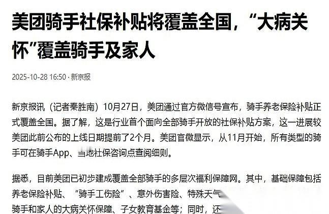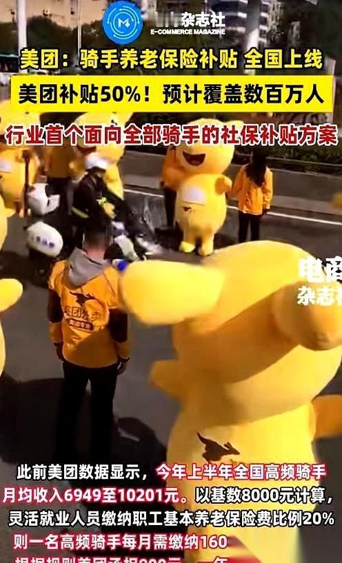 我发誓,前几个月全网还在追着骂某团。 就因为东哥那边先甩了个王炸,说要给骑手缴五险一金,好家伙,那架势,直接把“对骑手好”这事儿给顶上了热搜。 当时谁不夸一句东哥仗义?然后扭头就对着某团指指点点:你看看你,磨磨唧唧,抠抠搜搜。 说真的,当时我也跟着骂了两句。 结果呢? 现在感觉脸有点疼。 人家不是不做,是憋了个大招。最近直接官宣了,给全国骑手普及养老保险补贴。最骚的是,它不分什么全职兼职,不管你是天天跑单的核心员工,还是像我这样偶尔跑几单赚个烟钱的“野生骑手”,都能领。 我靠。 这一下就把格局打开了。 以前总觉得,我们这种“灵活就业”的,说白了就是个临时工,是平台的“耗材”。刮风下雨你得跑,出了事自己扛,未来?未来是什么?谁跟你谈未来? 现在,有人开始跟你谈“养老”了。 这事儿的意义,早就超出一个外卖平台了。它像是在给所有打零工的人喊话:你们不是工具,你们也是人。你们的未来,也该有个着落。 在城市里像一颗螺丝钉一样奔波,谁不是为了碎银几两?但如果能在这份奔波里,看到一点点关于明天的保障,那感觉,真的不一样。 那是一种“被看见”的感觉。