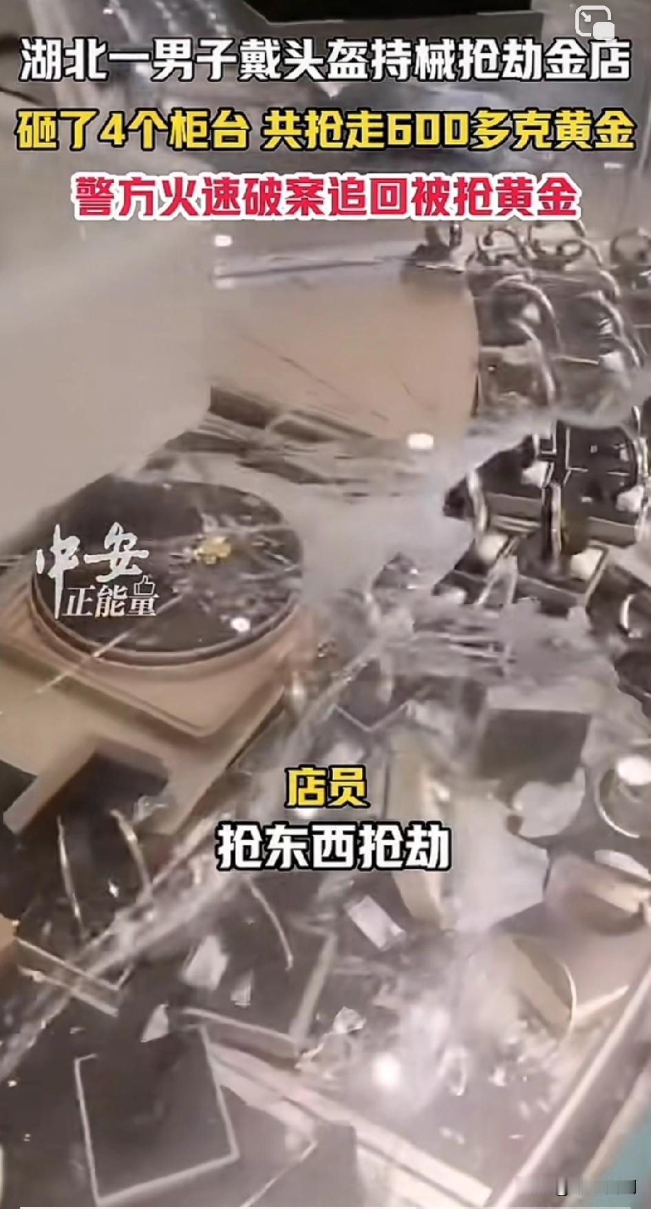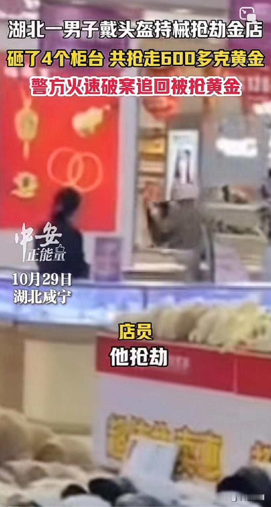 头盔男抢劫金店吓坏小姑娘! “啊!有人抢劫!报警!报警!” 10月29日,湖北咸宁。湖北一男子戴头盔持械抢劫金店,砸了4个柜台 共抢走600多克黄金。警方火速破案追回被抢黄金。 抢600多克黄金价值50多万了,至少十年起步,何况抢劫是重罪,十五年算少了[笑哭] 有网友爆料前几天上海也有人抢劫金店 但是金店又没任何损失 也没人受伤 他没伤害任何人!