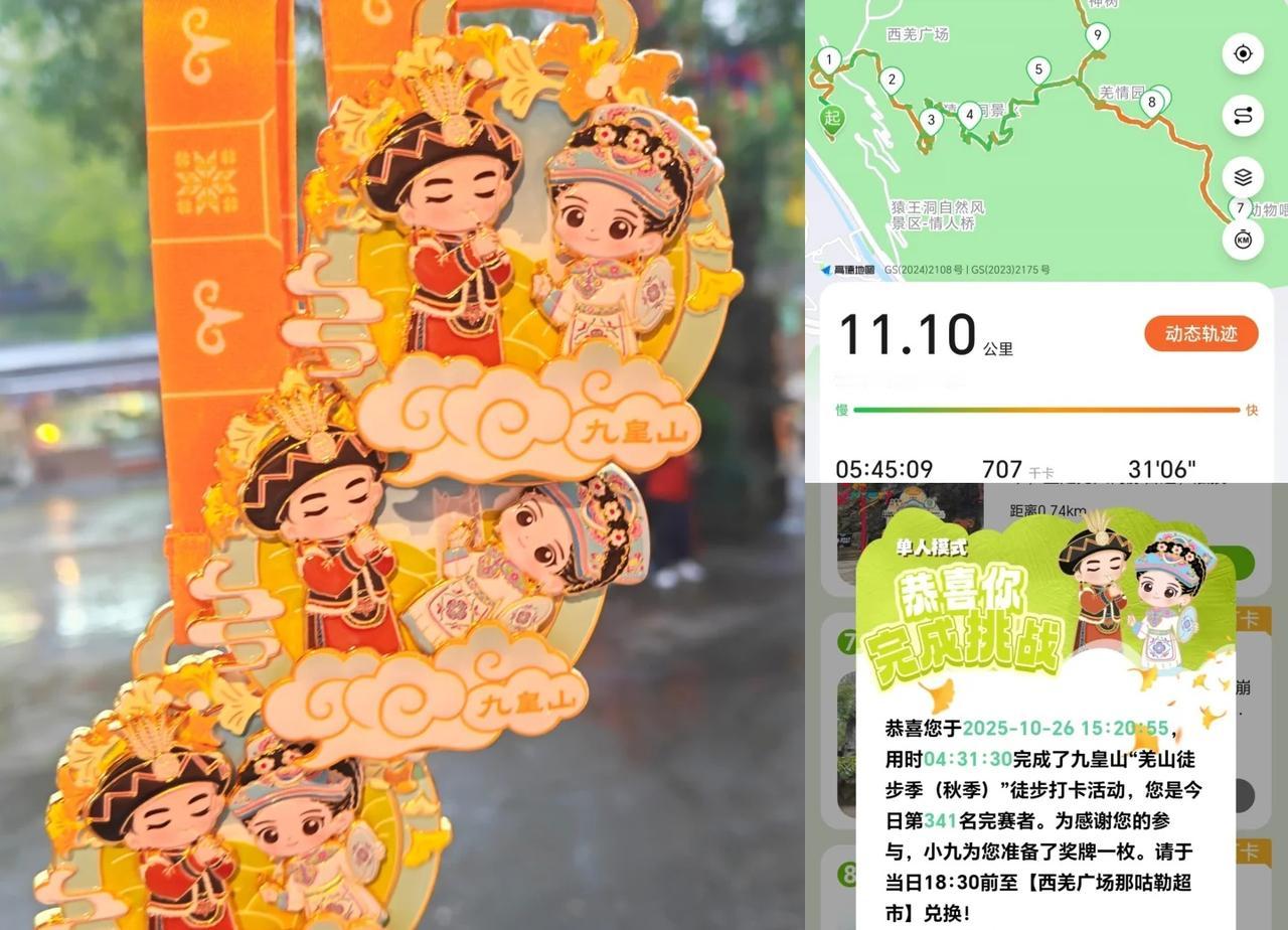 九皇山徒步奖牌 【交通】:成都自驾过去,车程2.5小时-3小时 【门票】:免费,趁着免门票去的。山上有索道,两段一起买的话是140,分开买的话就是100+50=150元。 【徒步领奖牌】: [一]打卡点: 共8个,游客中心(起点)—前山游步道出口—大禹殿—绝壁栈道入口—绝壁栈道中点/尔玛古道(二选一)—飞石—云中农场—惊喜任务(带话题发到社交平台) [二]游客中心在山脚,距离检票口(也就是第二个打卡点附近)大概需要走40分钟左右,这段路基本也都是梯子 [三] 第三个打卡点是大禹殿,大禹殿打卡点旁边走过玻璃桥(图7),然后坐玻璃滑道(玻璃桥和玻璃滑道都是包含在体验券的,需要刷脸)下去,就到了第四个打卡点,也就是绝壁栈道入口(图9) [四]绝壁栈道入口的左边,就是猿王洞了(图13-15),猿王洞是免费的,不需要刷脸检票。猿王洞游览大概半小时,洞内还是很漂亮的,值得去看一下 [五] 绝壁栈道入口—绝壁栈道中点,这是本段行程中最最废脚的路程了❗️❗️❗️如图10-12,有些会更陡峭,全程都是梯子,但是景色还是很不错的,我大概走了50分钟左右 [六] 绝壁栈道中点—飞石,这段路也是很多梯子,但是会比绝壁栈道入口—绝壁栈道中点这段路稍微好一些。到了飞石打卡点后,基本就是平路了,1公里多路就到云中农场打卡点了。云中农场有很多拍照打卡点,拍照好看 [七]整个徒步行程耗时4个半小时,完成打卡后,坐索道返回到第二个打卡点去领取奖牌,然后再坐索道到山下游客中心。奖牌兑换时间和索道最晚时间都是18:30,需要提前看好时间哦❗️❗️❗️❗️ 户外徒步登山旅游 户外登徒步 九皇山 九皇山徒步 徒步丈量世界 徒步奖牌 想看看你登上最高的山 登山不止向未来 征服一座山