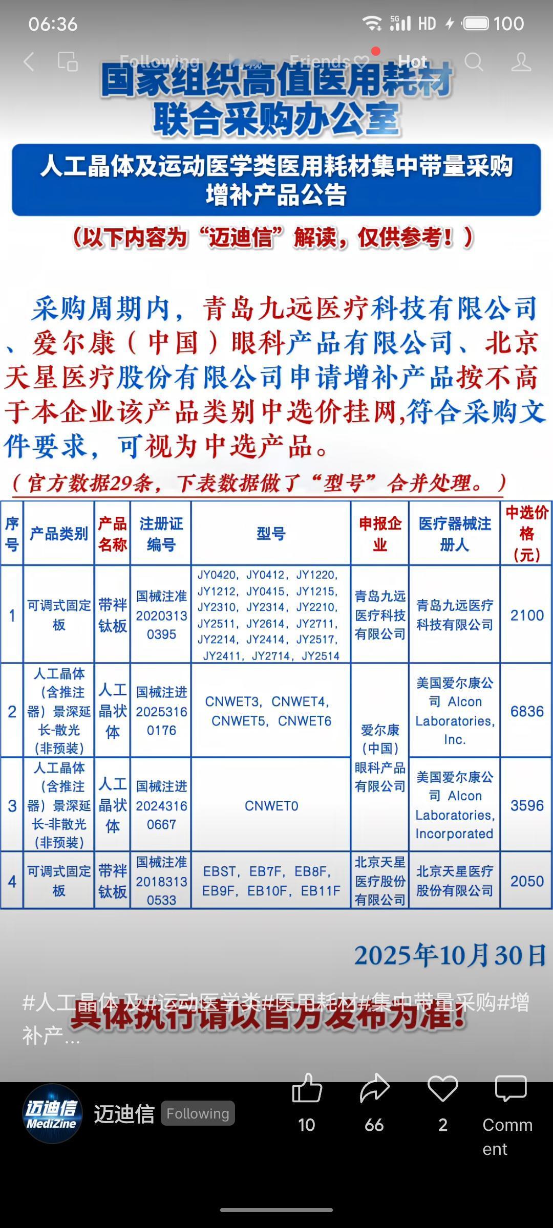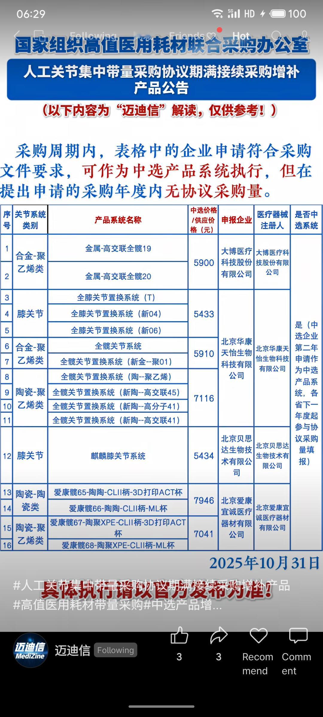 国家组织高值医用耗材联合采购办公室近日发布两批集采增补产品公告。人工关节集采接续新增大博医疗、北京爱康宜诚等企业部分产品,中选价格介于5433元至7946元。人工晶体及运动医学类集采新增青岛九远、爱尔康、北京天星相关产品,可按不高于其中选价挂网,价格从2050元至6836元不等。上述增补产品在采购周期内可视同中选产品。